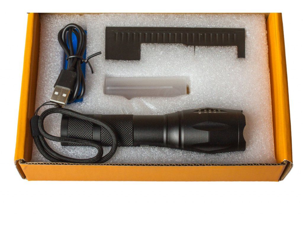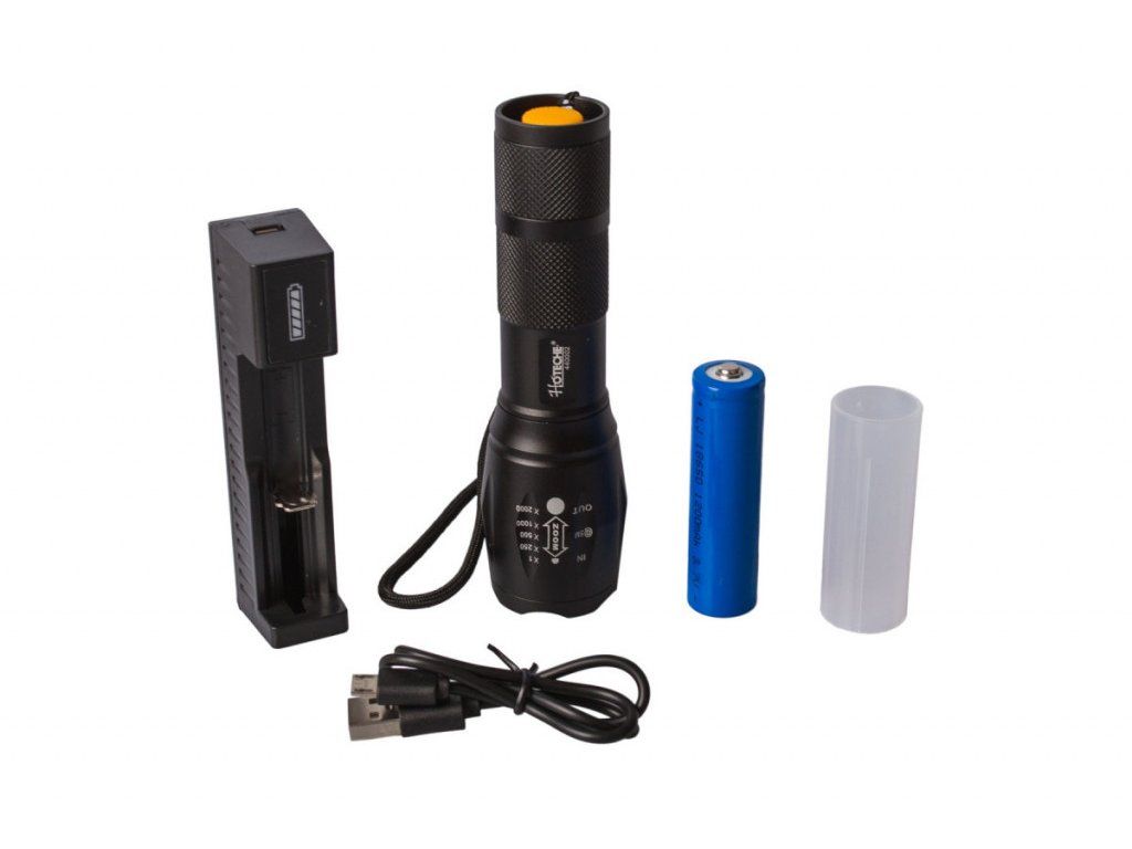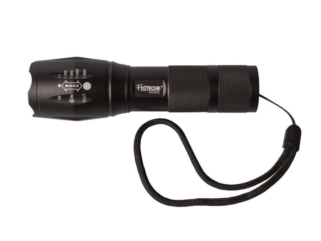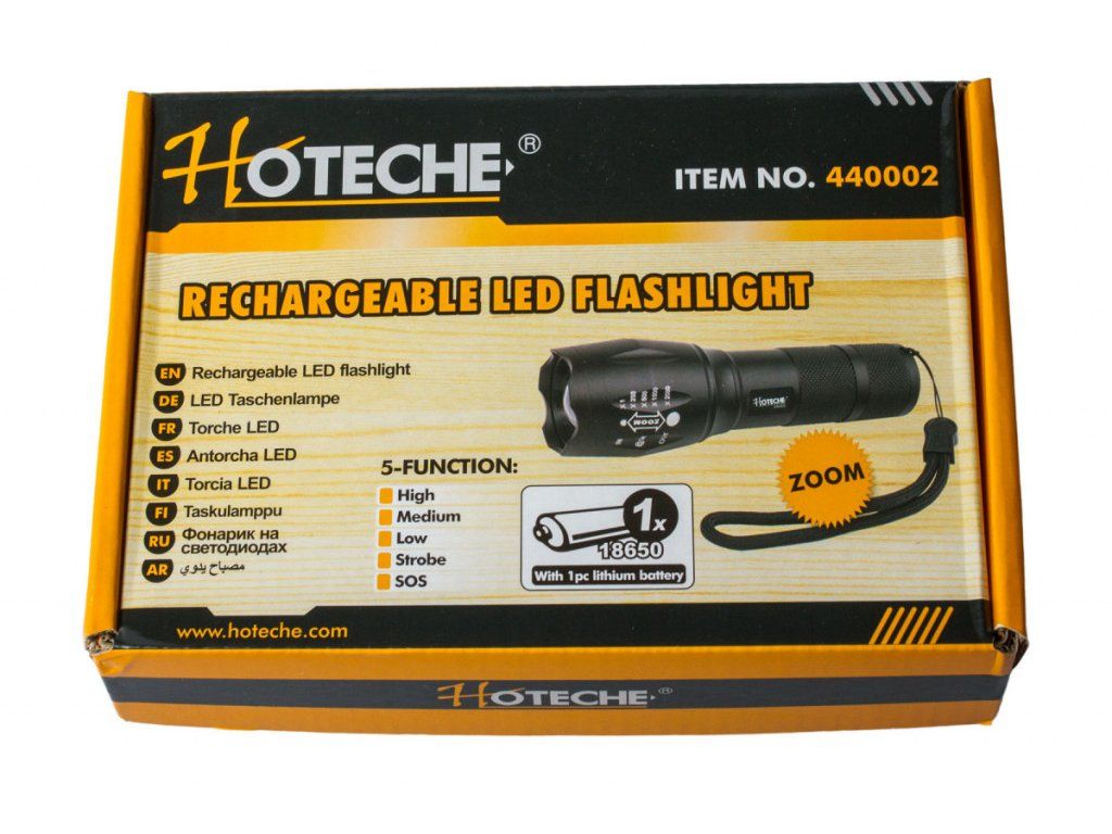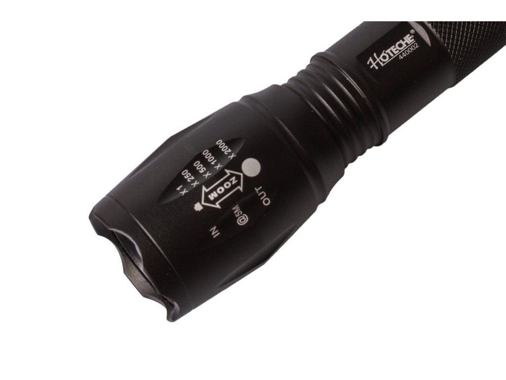 Kapesní LED baterka značky Hoteche, která disponuje pěti funkcemi. Mezi funkce zařazujeme SOS, strobo, nízké, střední a vysoké svícení. Baterka dokáže zoomovat.