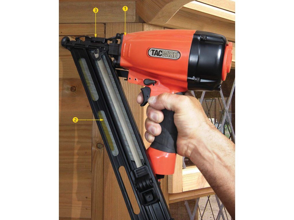 Pohodlí a bezpečnost: Průhled pro kontrolu plnosti zásobníku, čistý otočný výfukový systém, bezpečnostní rukojeť z měkké gumy, bezpečnostní spoušť, na jednotlivé výstřely i výstřely v sérii, pryžová krytka proti otlaku ústí v materiálu, lehké tělo ze slitiny magnesia. Sklon zásobníku umožňující přibíjení i v nepřístupných místech