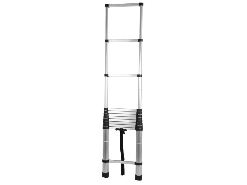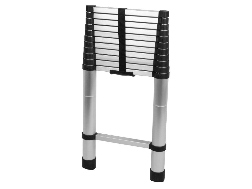 Teleskopický žebřík pro práci v terénu a na cestách. Žebřík ve složeném stavu zabere málo místa a díky malým rozměrům ho lze pohodlně uskladnit v garážích, dílnách nebo při převozu.