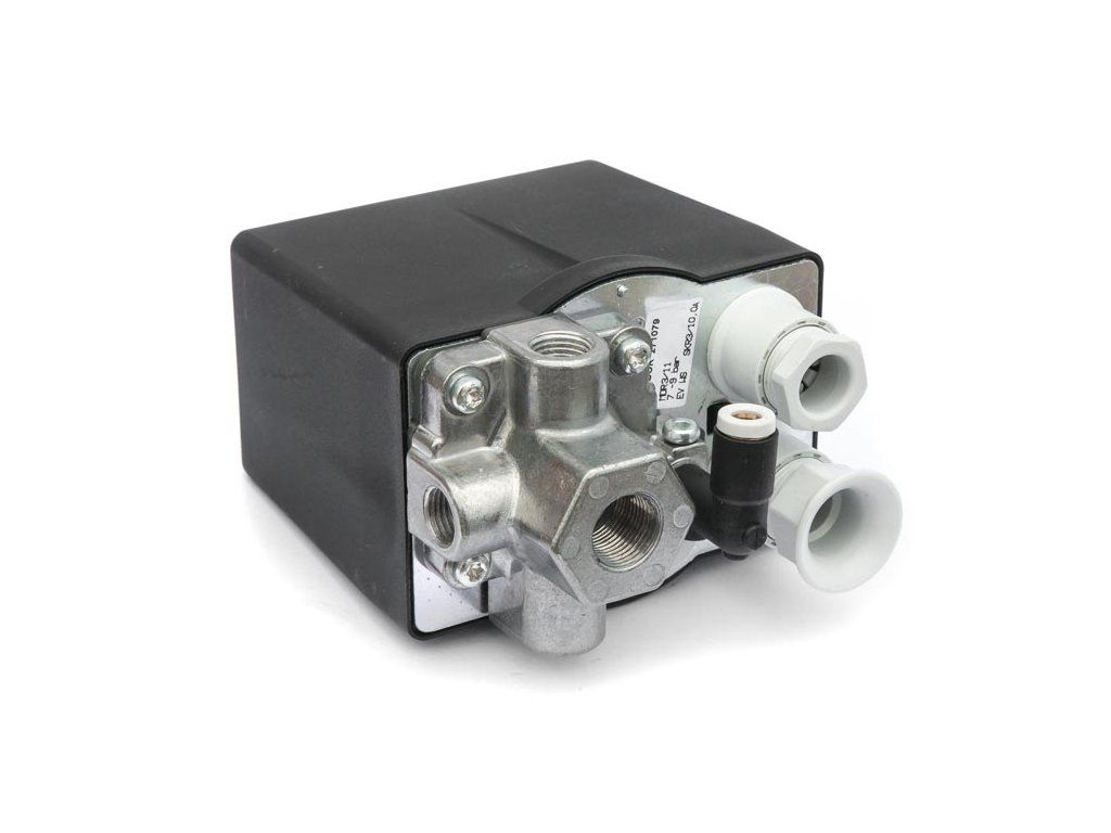 Tlakový spínač s nastavitelným vypínacím tlakem 4 – 11 bar. Třípólový vypínač a odvzdušňovací ventil. Pro kompresory s elektromotory 2,2 - 4 kW.