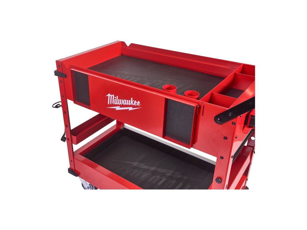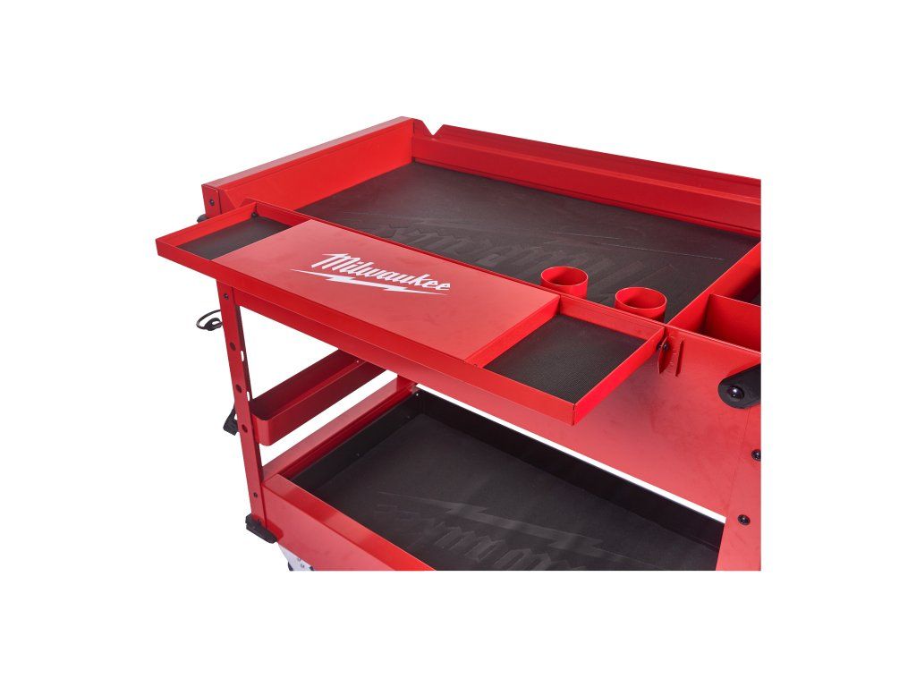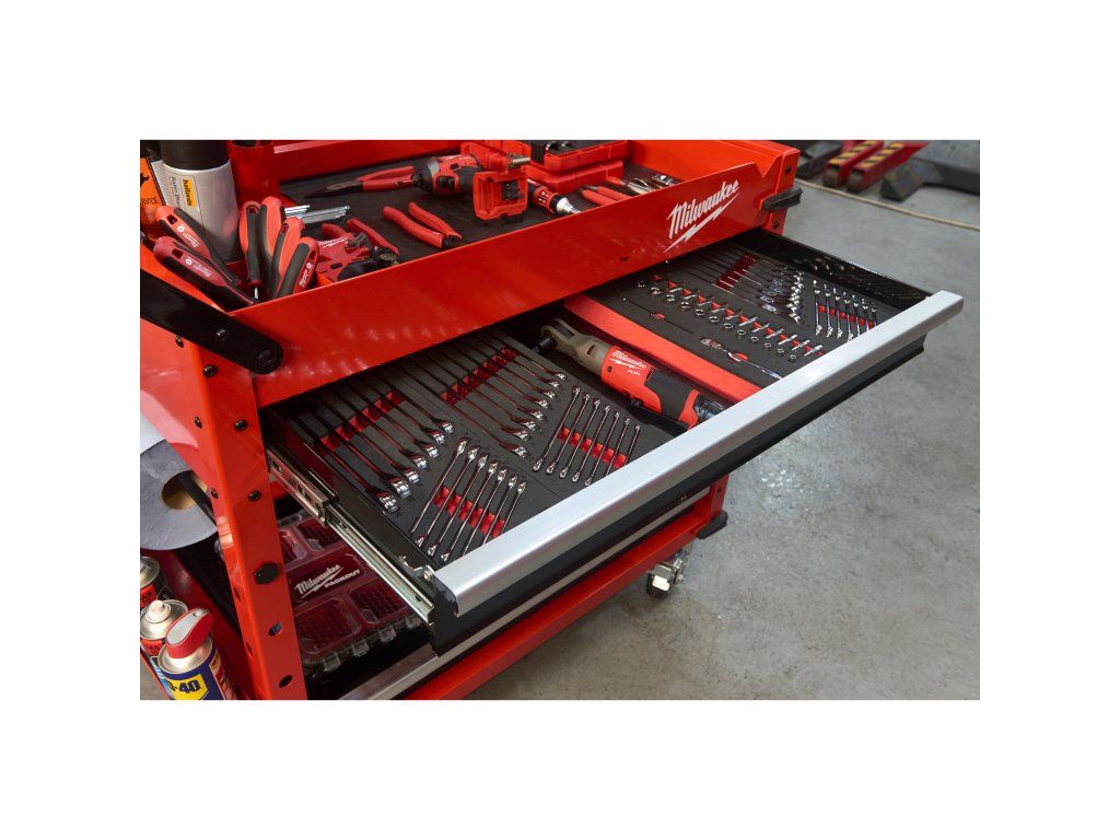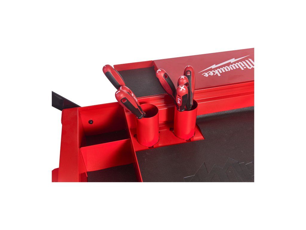 - 2 odnímatelné úložné misky, které lze převrátit vzhůru nohama pro vytvoření rovného povrchu, nebo zcela vyjmout pro vertikální uložení dlouhého nářadí.
