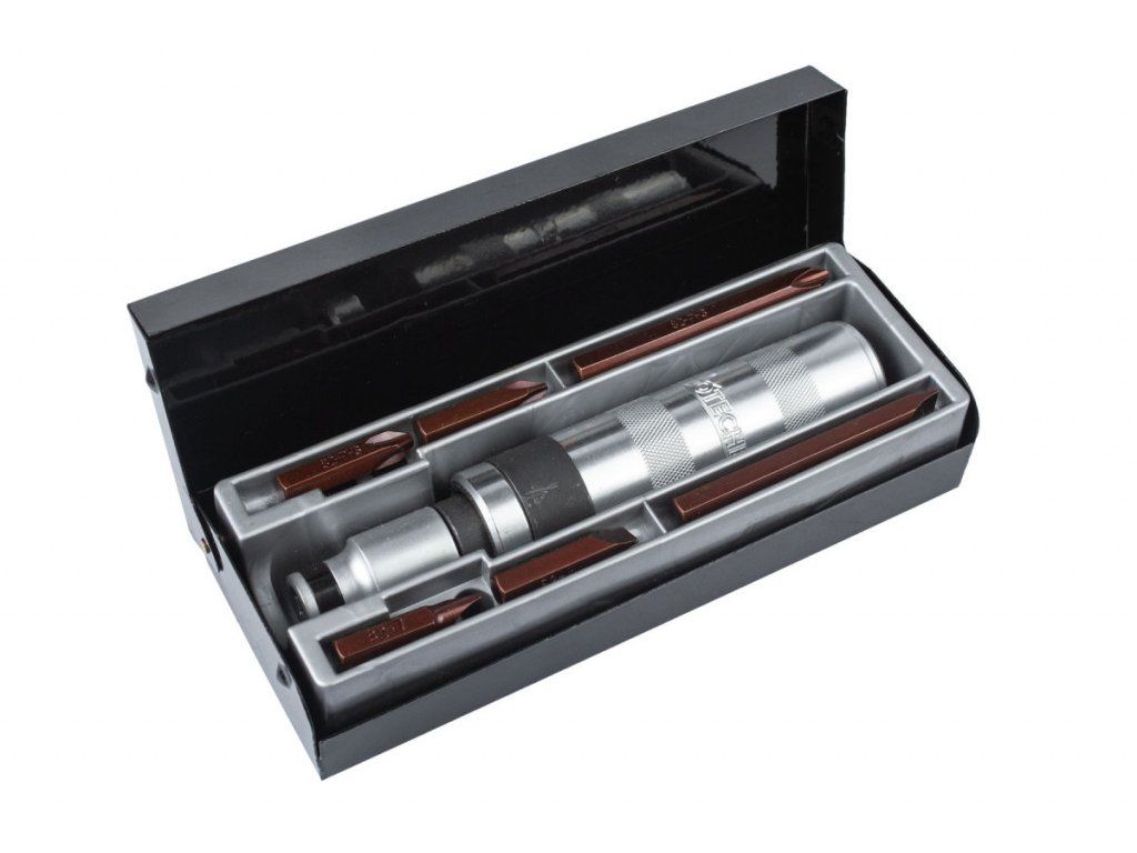 Sada od značky Hoteche, která obsahuje úderový šroubovák s plochými (3 ks) a křížovými (3 ks) bity v boxu.