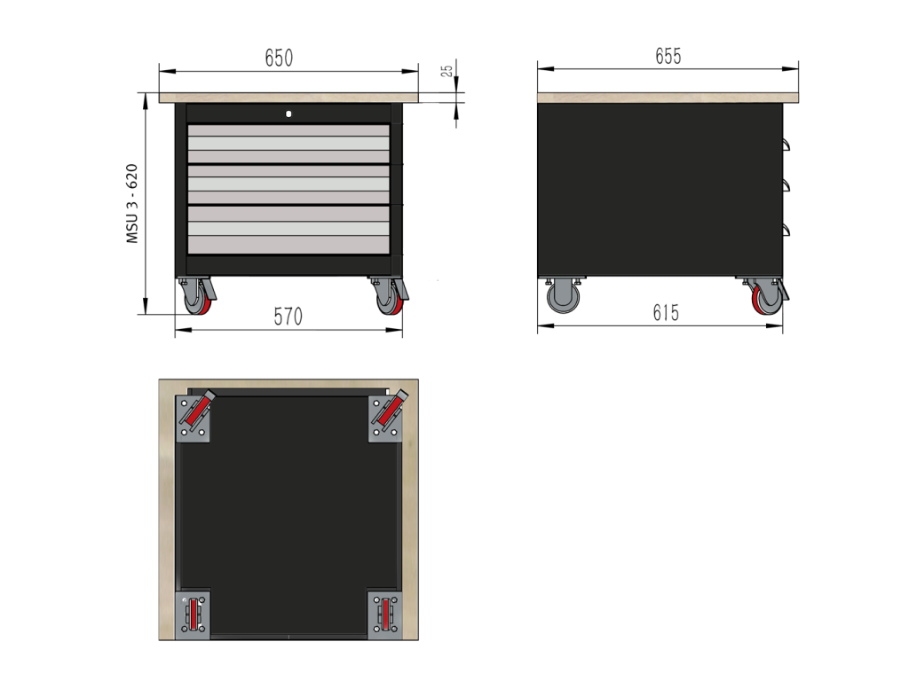 Univerzální pojízdný podstavec / montážní stůl se třemi uzamykatelnými zásuvkami.