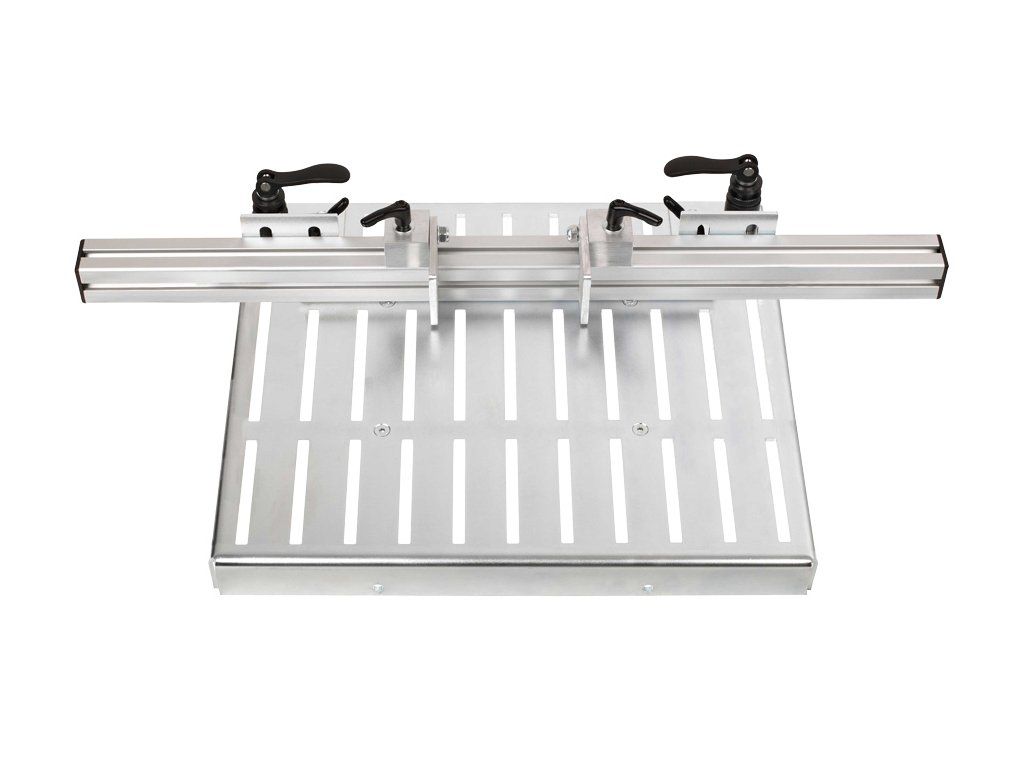 - Volitelné prodloužení stolu je připevněno k bočním montážním lištám a rozšiřuje upínací desku vlevo, vpravo nebo vpředu