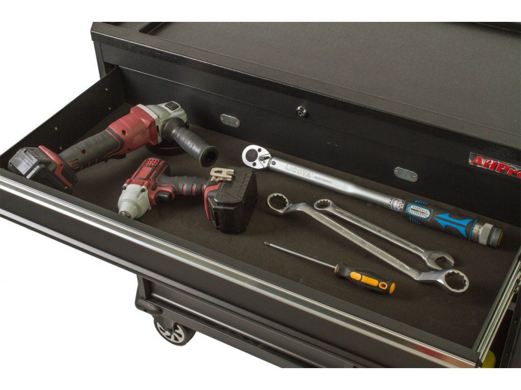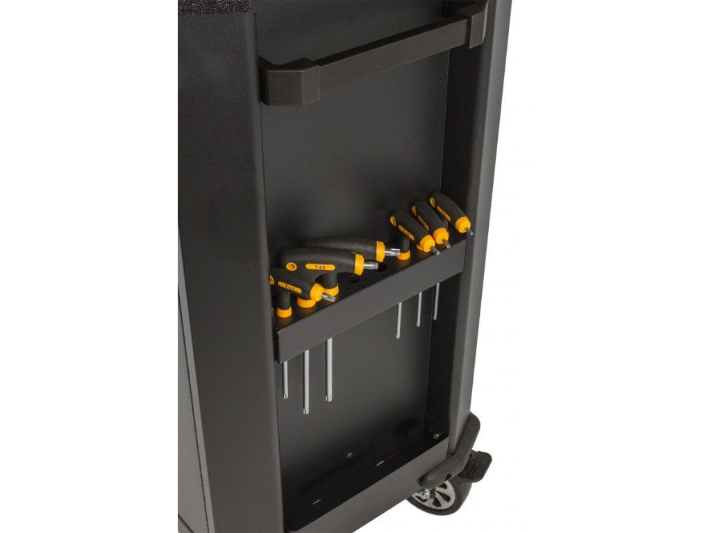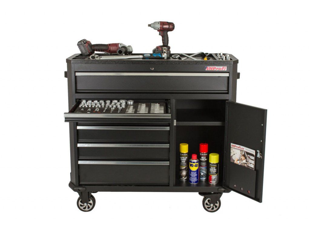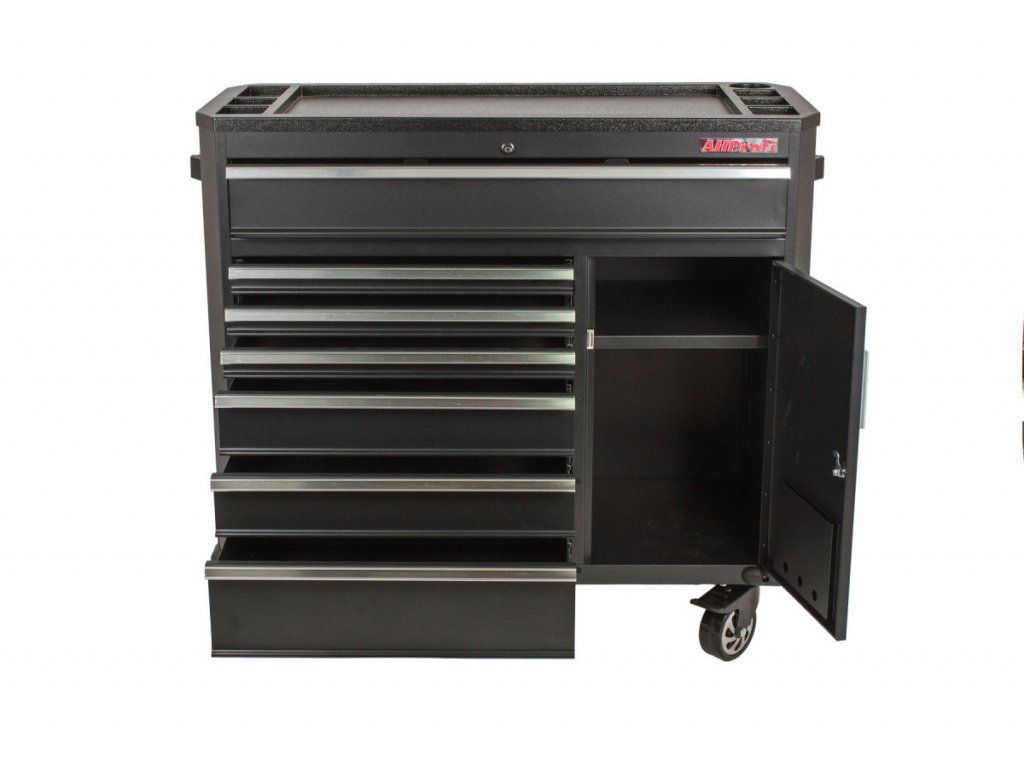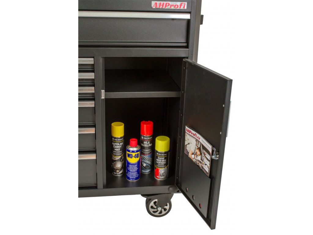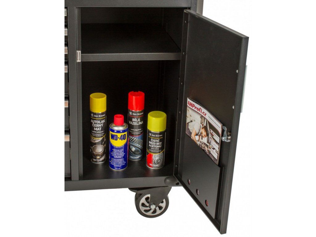 Černá pojízdná skříňka s celkovými rozměry (Š x V x H) 1091 x 1027 x 470 mm. Vozík je vybavený 7 šuplíky s různými rozměry. Dále má skříňku, ve které je nastavitelná polička a na bocích skříňky jsou úložné systémy. Všechny úložné prostory jsou zamykatelné.
