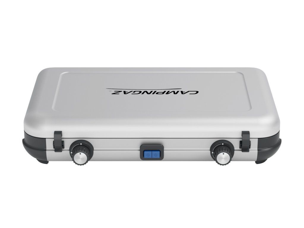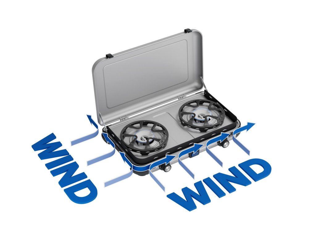 Vařič Camping Kitchen 2 Maxi má dva nezávislé hořáky pro individuální regulaci tepla. Při vaření pro větší rodiny nebo skupiny nabízí velké podpěry pro pánve a hrnce o průměru až 28 cm, pro použití všech běžných kuchyňských hrnců a pánví. I když je počasí nepředvídatelné, technologie Flame Guard hořáků je navržena pro optimální ochranu plamene pro nejlepší výsledek i při vaření v přírodě. Díky zesíleným pantům spojujícím víko se základnou se celý vařič stává vlastním kufříkem pro čisté a rychlé sbalení před cestou i po ní. Podpěry pánví jsou odnímatelné pro snadné čištění i v nepohodlných podmínkách. Zapalování: piezoelektrické.Materiál: tělo z lakované oceli, vysokoteplotní barva. Nosný materiál pánve: smaltovaná ocel (černá).Doplňkové parametry