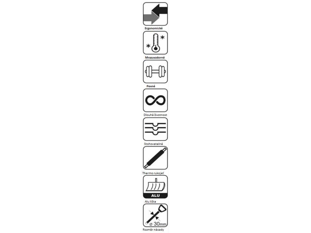 je ideálním pomocníkem pro odklízení sněhu, bláta, ale i pro nakládání sypkých materiálů. Pracovní část hrabla je vyrobena z vysoce teplotně i mechanicky odolného PP plastu s odolností až -32 oC, navíc zakončeného hliníkovou lištou. Násada hrabla na sníh je vyrobena z hliníku, která je pro zvýšení mechanické odolnosti, ale i uživatelského komfortu navíc potažena termo-plastem a zakončena ergonomicky tvarovanou rukojetí z ABS plastu pro pohodlný úchop.