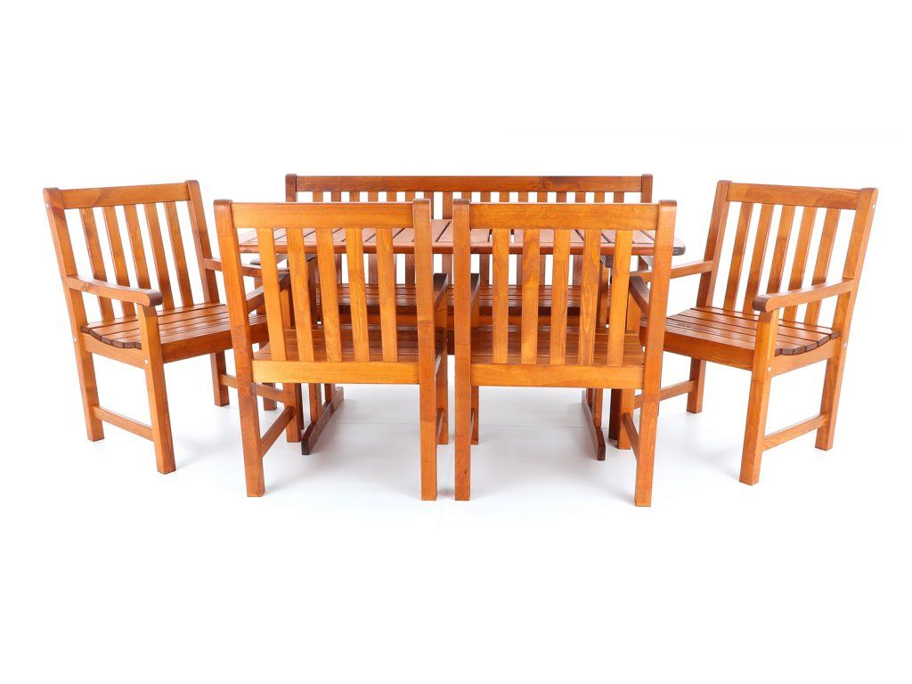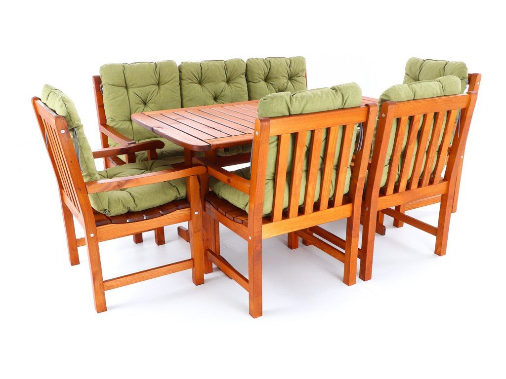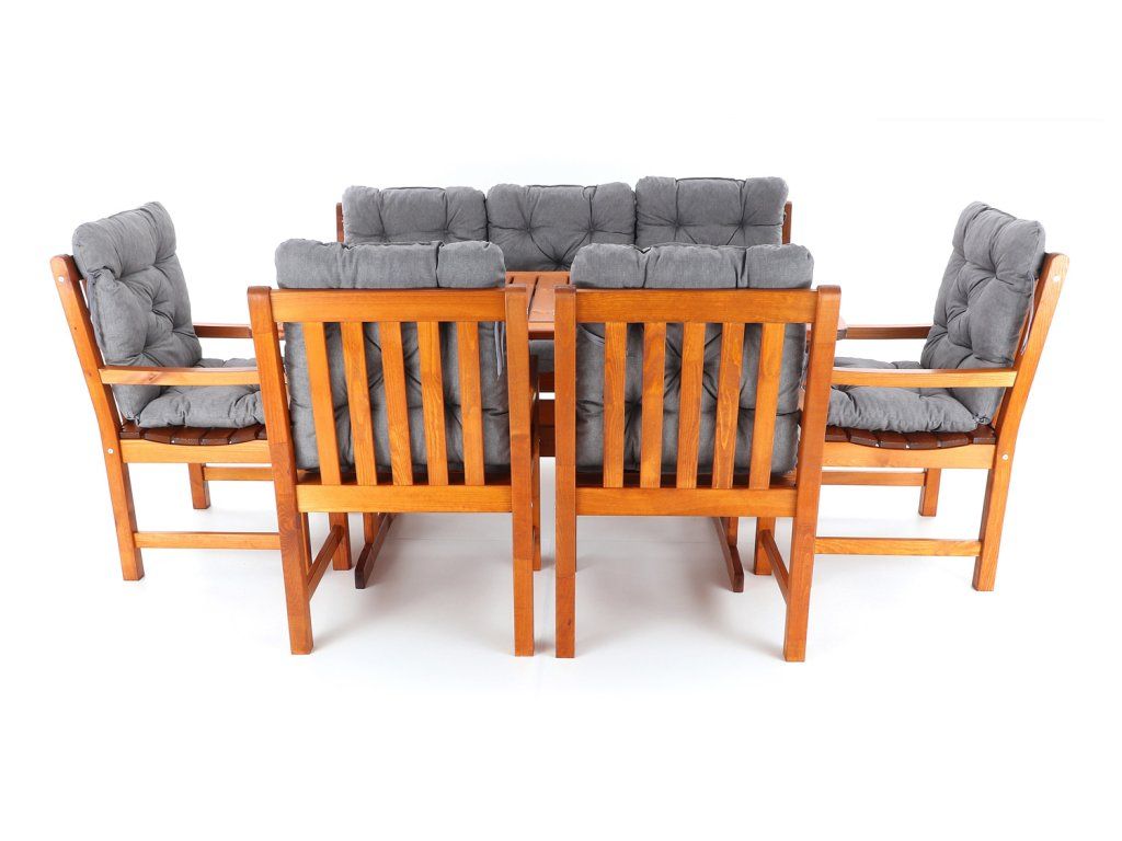 Luxusní masivní stolová sestava čtyř křesel, jedné lavice a stolu z odolného a trvanlivého dřeva severské borovice. Odolné dřevo a velmi robustní konstrukce řadí tuto sestavu mezi nejmasivnější výrobky ve své kategorii na trhu.