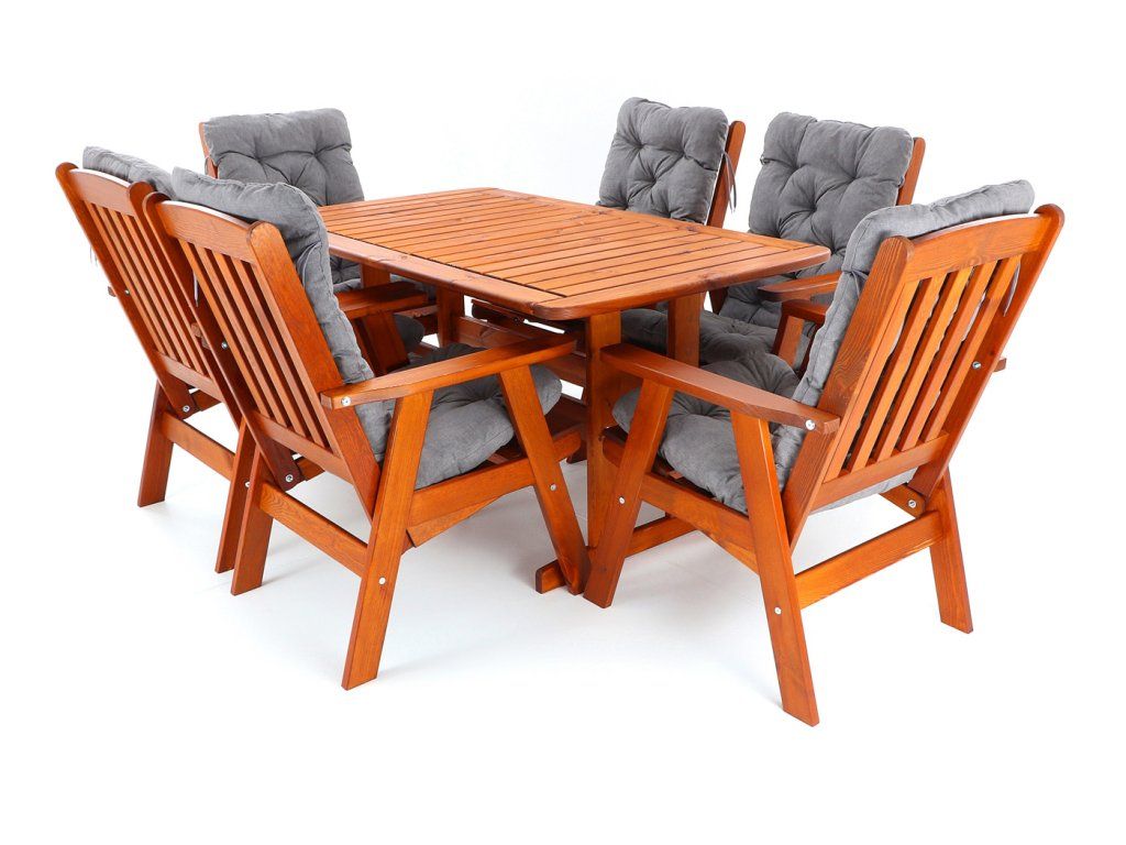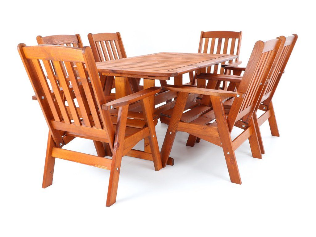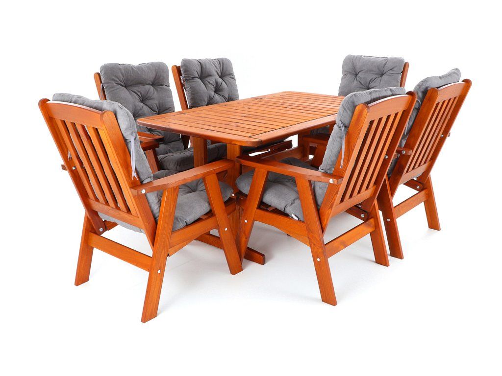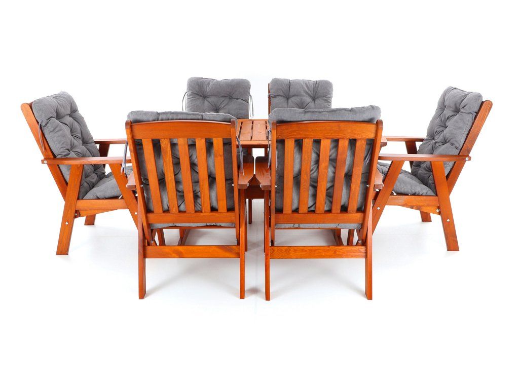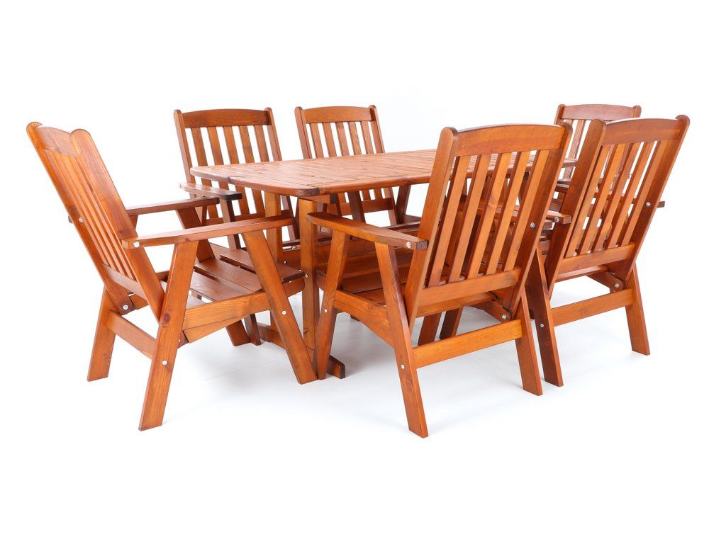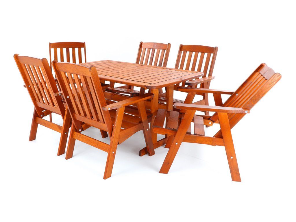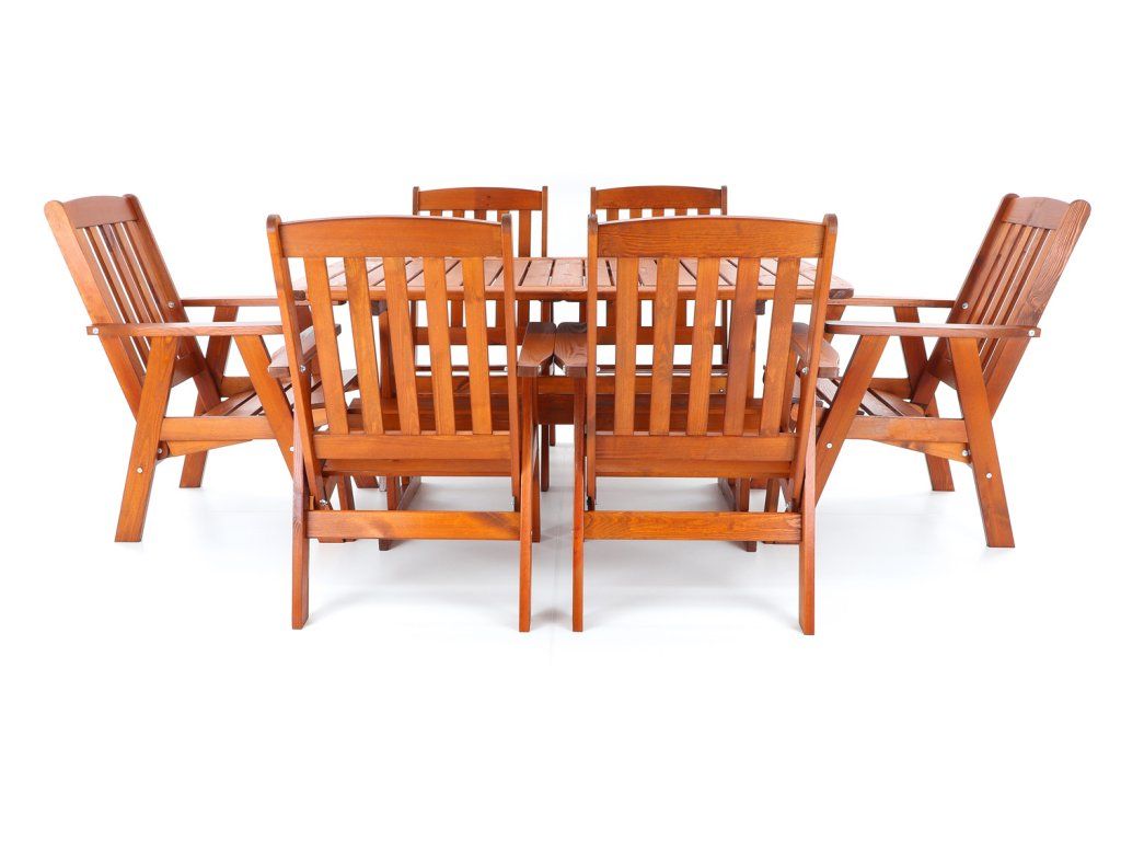 Luxusní masivní stolová sestava šesti polohovacích křesel a stolu z odolného a trvanlivého dřeva severské borovice. Odolné dřevo a velmi robustní konstrukce řadí tuto sestavu mezi nejmasivnější výrobky ve své kategorii na trhu.