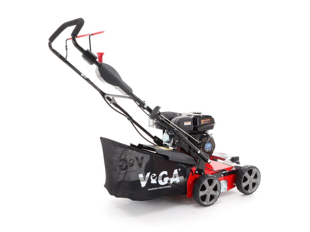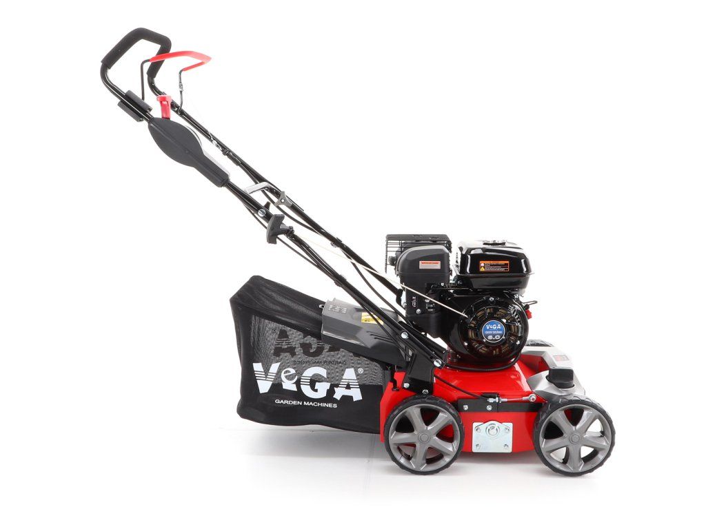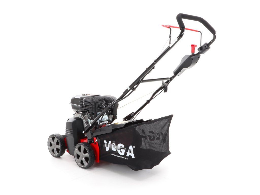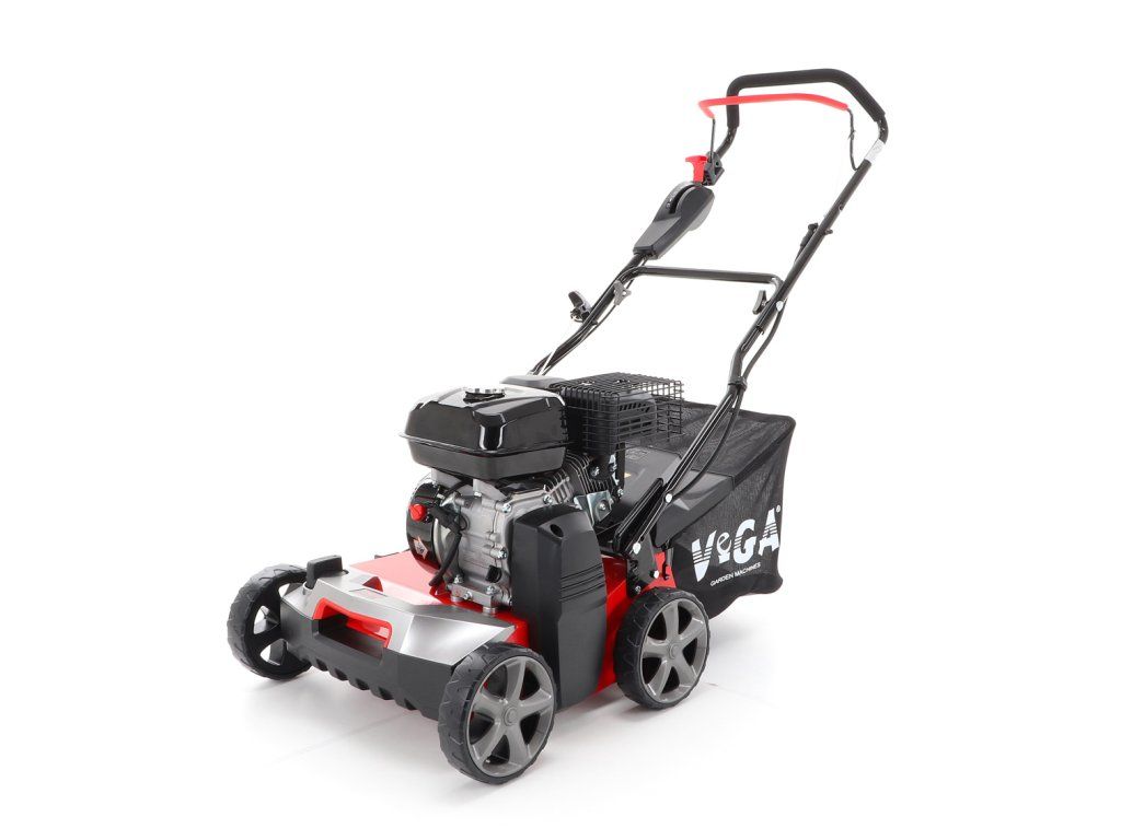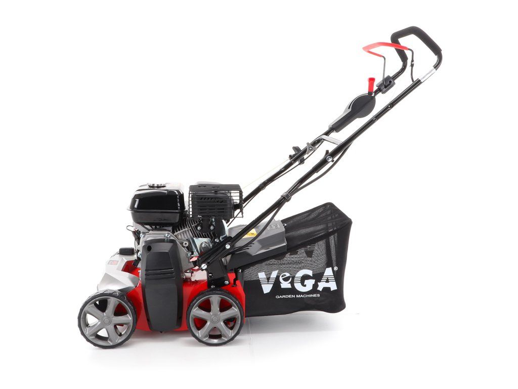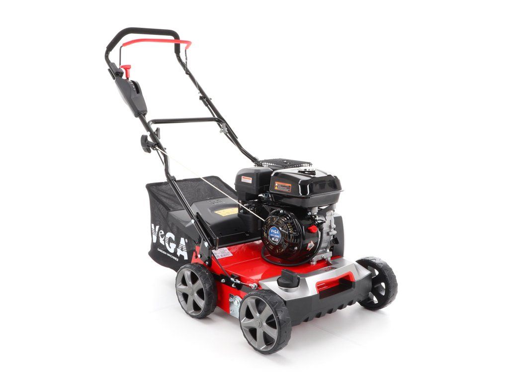 Motorový provzdušňovač trávníků VeGA TS40-W 3in1 s motorem VeGA 6HP, šířka pracovního záběru je 400 mm, plynulé centrální nastavením výšky, šasi je z oceli, sběrný koš o objemu 45l.