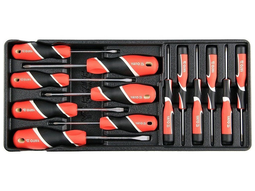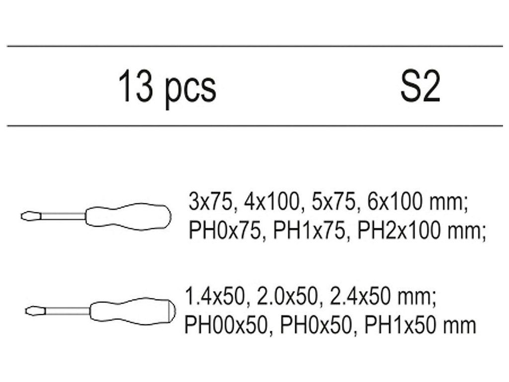 Sada 13 kusů šroubováků z oceli. Sada je přehledně srovnána ve vložce do zásuvky z PVC.