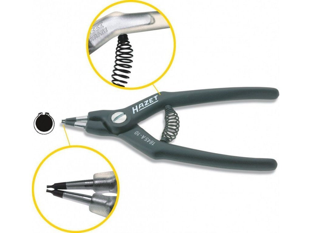 Vnější přímé kleště tvar A na pojistné kroužky. Délka 180 mm. Pevné držení přídržných kroužků díky vysoce přesným kuželovitým špičkám (fosfátované).