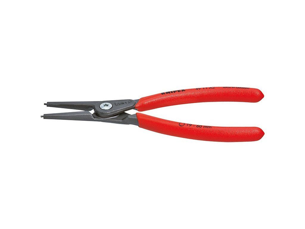 Vnější přímé kleště o délce 320 mm na pojistné kroužky od německého výrobce Knipex. Rukojeť potažena plastem, který brání sklouzávání. Snadná a bezpečná montáž díky přesně lícujícím, nasazeným a nalisovaným hrotům z vysoce zhuštěné pružinové oceli poskytují vysokou míru zabezpečení proti přetížení, např. při demontáži uvázlých těsnicích kroužků. Velké dosedací plochy a poloha hrotů znesnadňují odskočení kroužků. Hroty jsou při jednorázovém přetížení o 30 % stabilnější oproti běžným kleštím, současně umožňují lepší přístupnost při montáži. Při dynamickém zatížení vydrží hrot až 10 x déle.