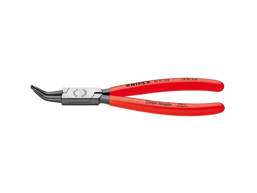 Vnitřní zahnuté kleště o délce 310 mm na pojistné kroužky, svorky zahnuté o 45°, kapacita pro průměr otvoru: 85 - 140 mm, stabilní hroty zabraňující sesmeknutí. Potaženo plastem.