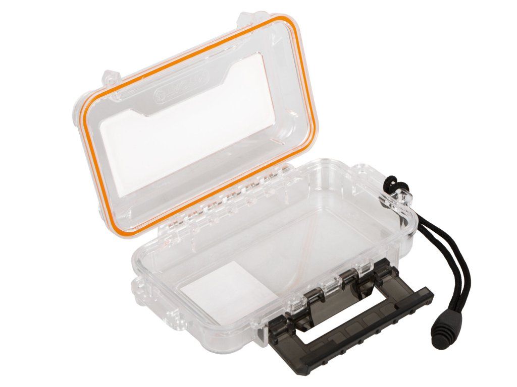 Vodotěsné pevné plastové pouzdro s poutkem pro zavěšení na zápěstí.