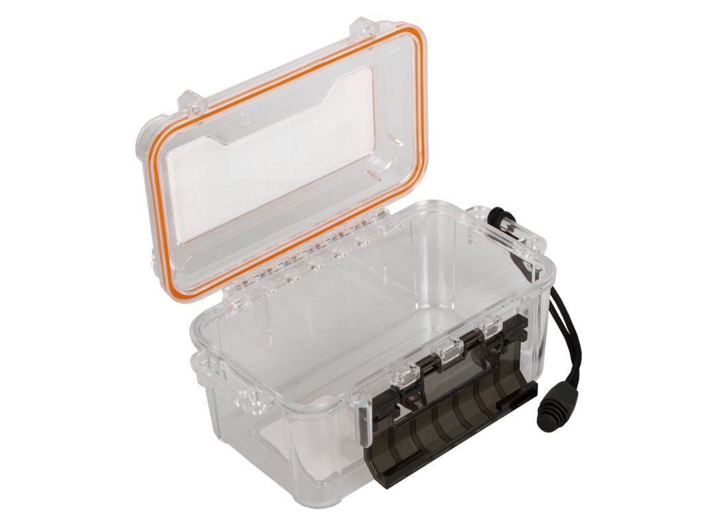 Vodotěsné pevné plastové pouzdro s poutkem pro zavěšení na zápěstí.