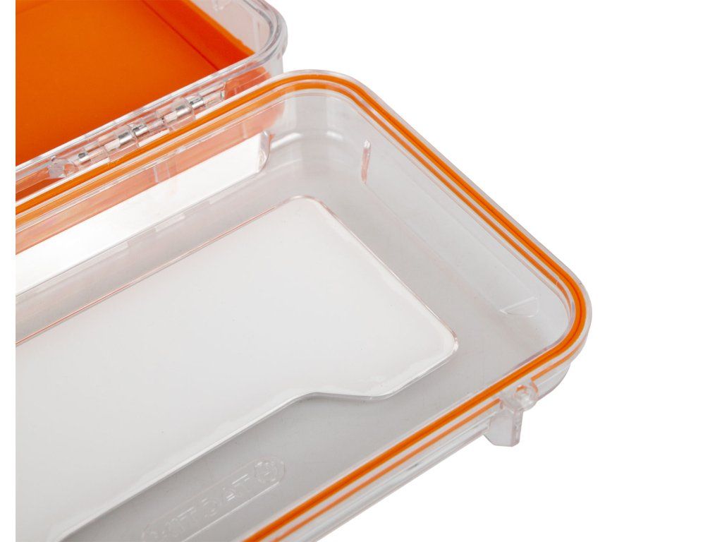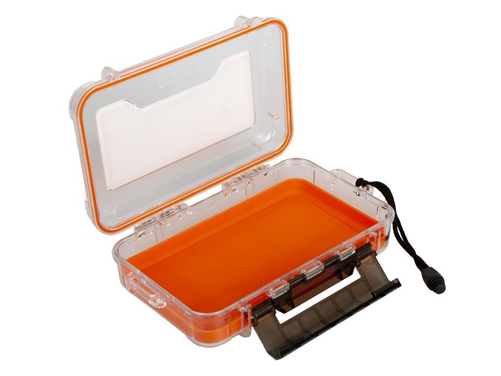 Vodotěsné pevné plastové pouzdro s poutkem pro zavěšení na zápěstí.