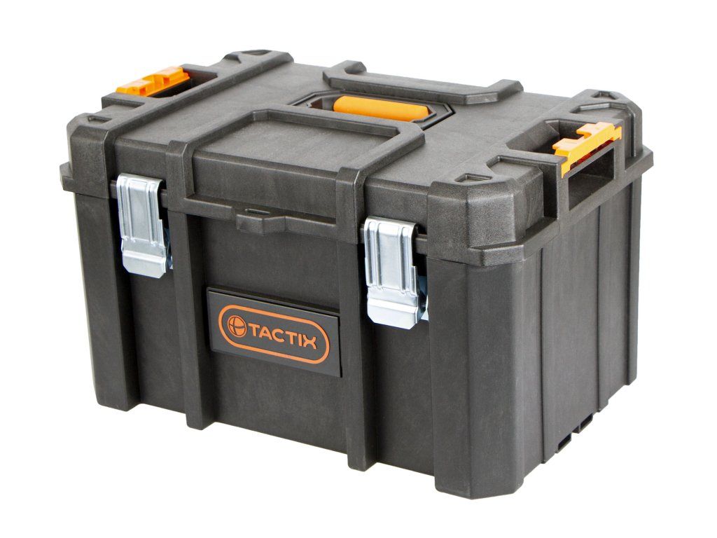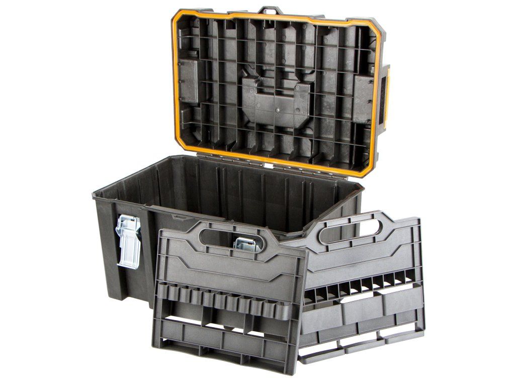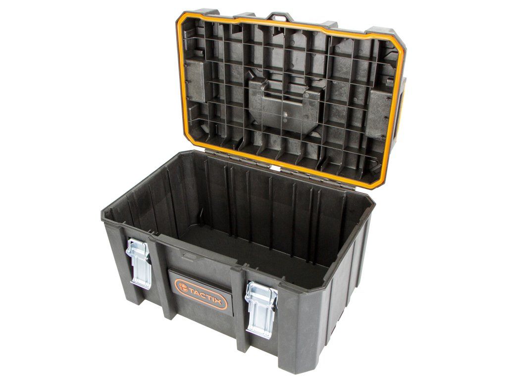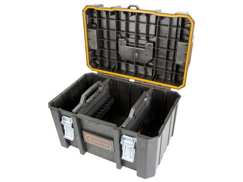 Odolný plastový kufr s vodotěsným provedením chrání obsah před vlhkostí, prachem a nečistotami. Je ideální pro bezpečné uložení nářadí a drobného materiálu.
