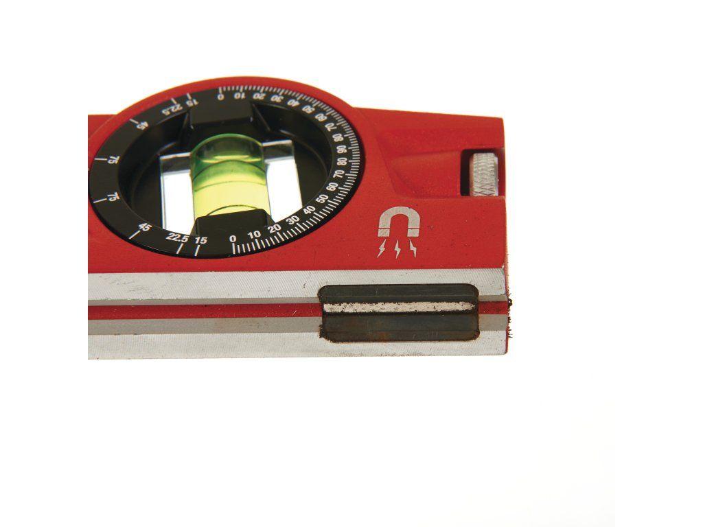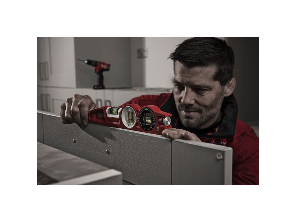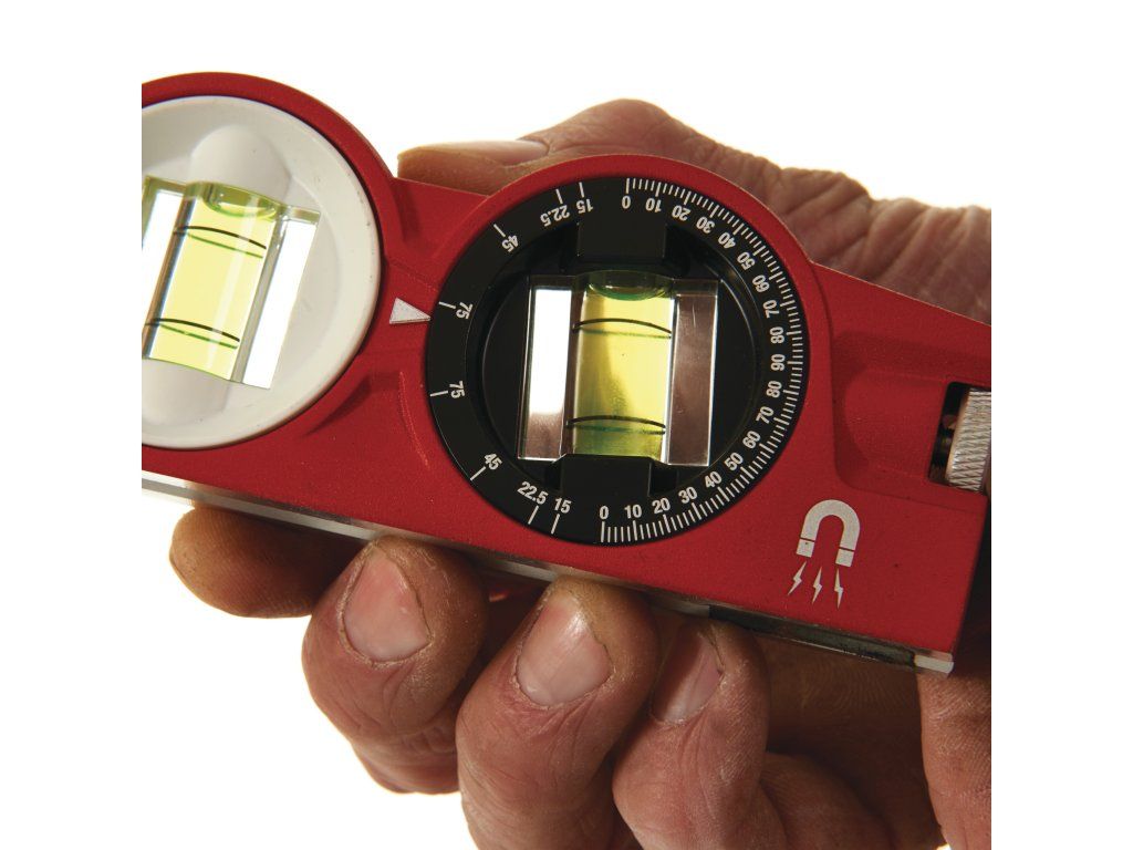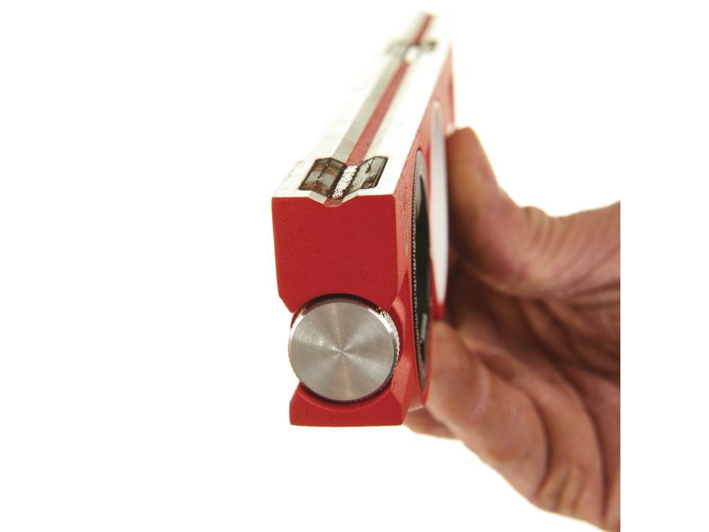 - 360° nastavitelná libela s možnosti uzamčení. Identifikuje a opakuje nastavení jakéhokoliv úhlu potřebného na pracovišti. Libela se uzamkne kvůli zajištění přesnosti měření, klidně i po vyjmutí z kapsy.