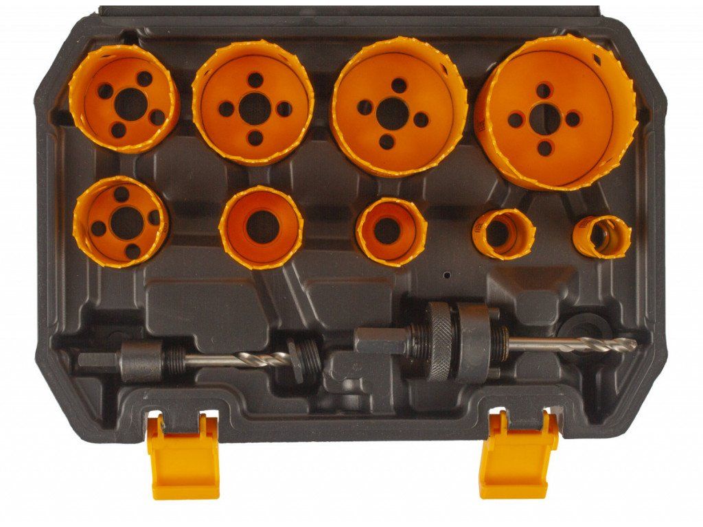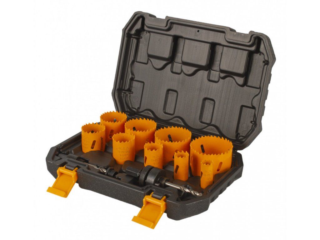 Set obsahuje dva adaptéry do vrtčky a 9 ks korunkových vrtáků o průměrech 19, 22, 29, 35, 38, 44, 51, 57 a 64 mm.