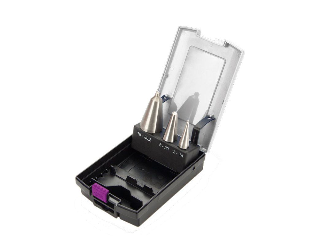 Sada kuželových vrtáků do plechu 3 – 14 mm / 8 – 20 mm / 16 – 30,5 mm.- S ostrým hrotem, není potřeba předvrtání