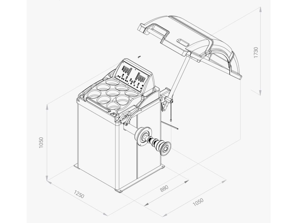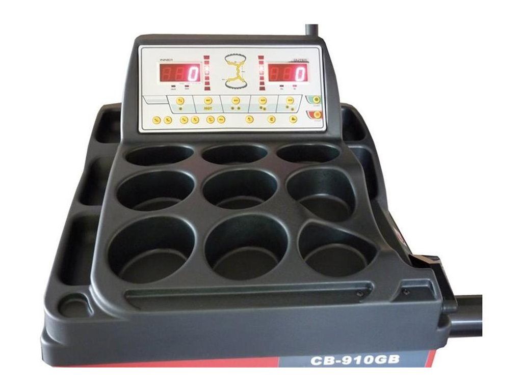 Vyvažovačka kol CB910GB má kompaktní konstrukci s malými rozměry skříně. Na první pohled zaujme velká délka vyvažovací hřídele, která umožňuje pohodlné aplikace závaží i u širokých disků.