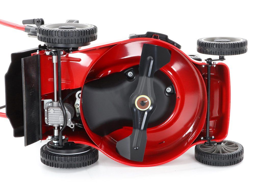 Pogumovaná sendvičová kola jsou uložena v oboustranných kuličkových ložiscích, centrální nastavení výšky sečení je u této značky samozřejmostí. Velkým nadstandardem u této sekačky je použita speciální třecí spojka na noži sekačky pod unášečem,