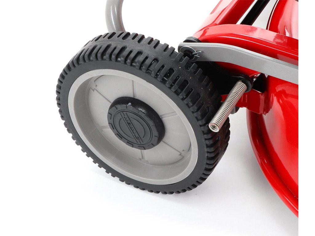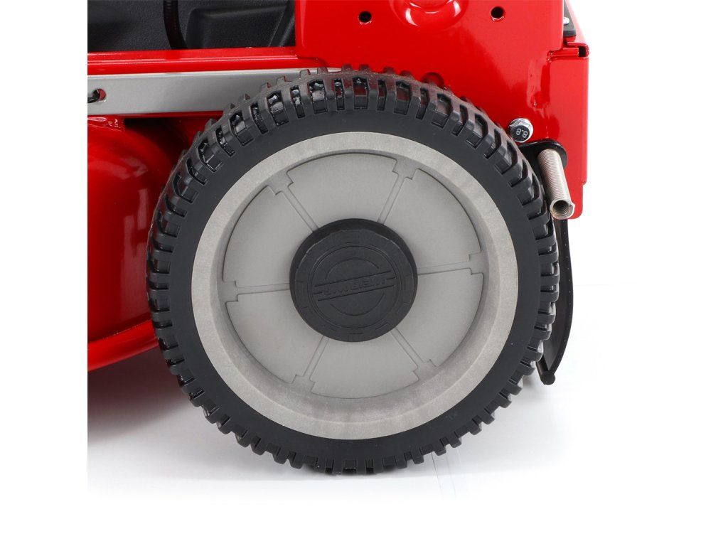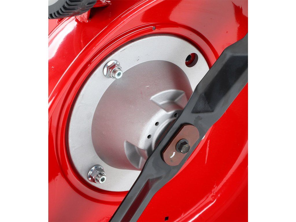 Výhoda silného motoru o výkonu 6 HP a speciálnlně tvarovaného silného mulčovacího nože Vám perfektně poseká nízkou i středně vysokou trávu. Pogumovaná sendvičová kola jsou uložena v oboustranných kuličkových ložiscích,