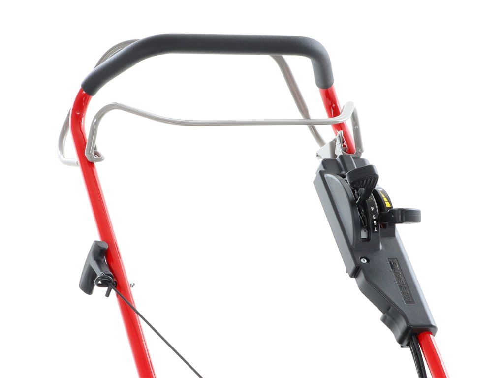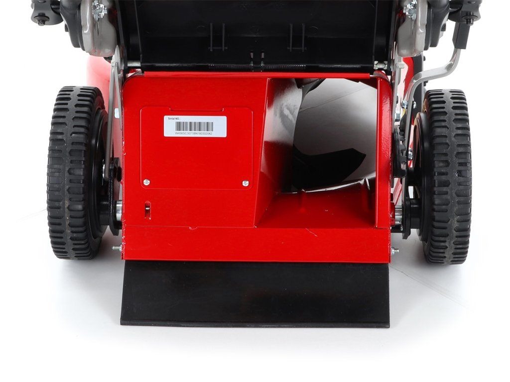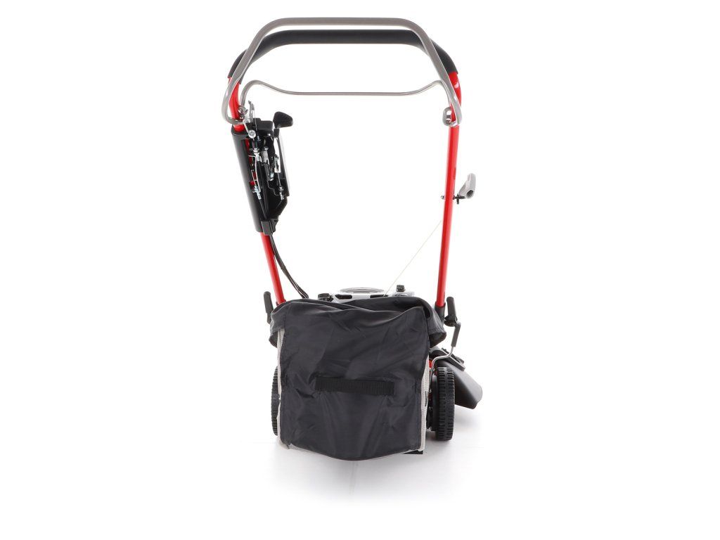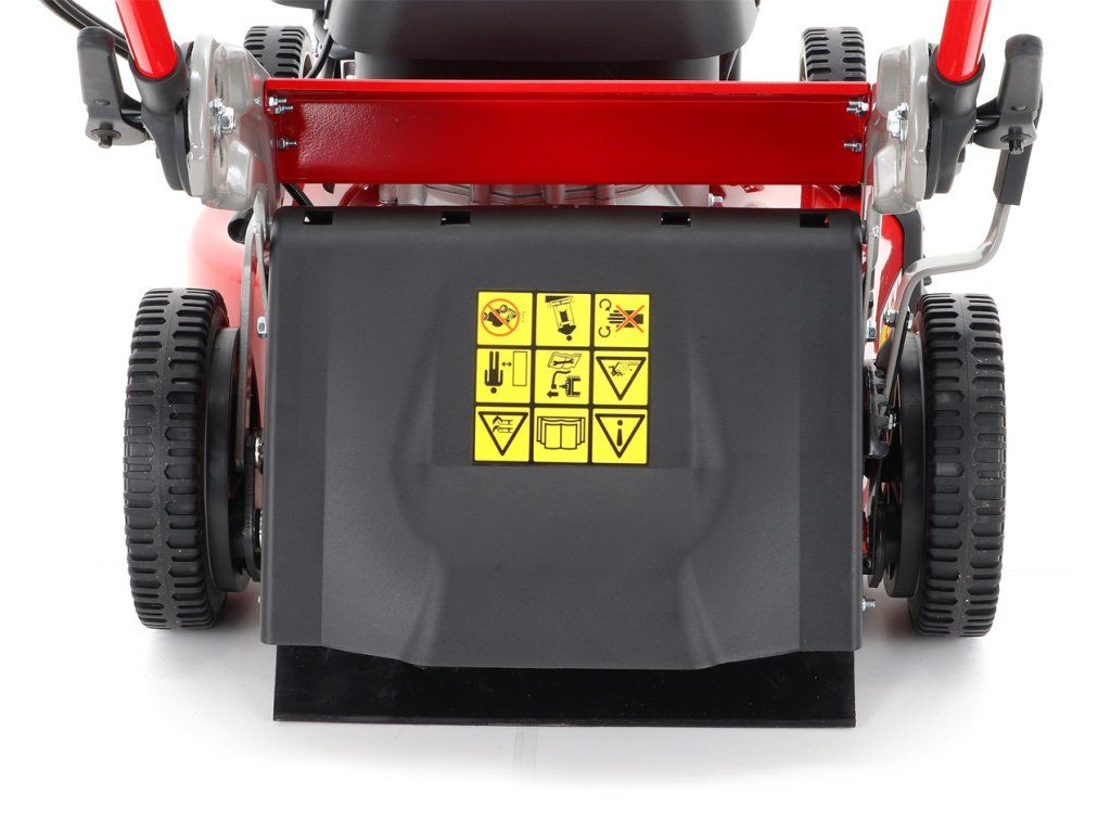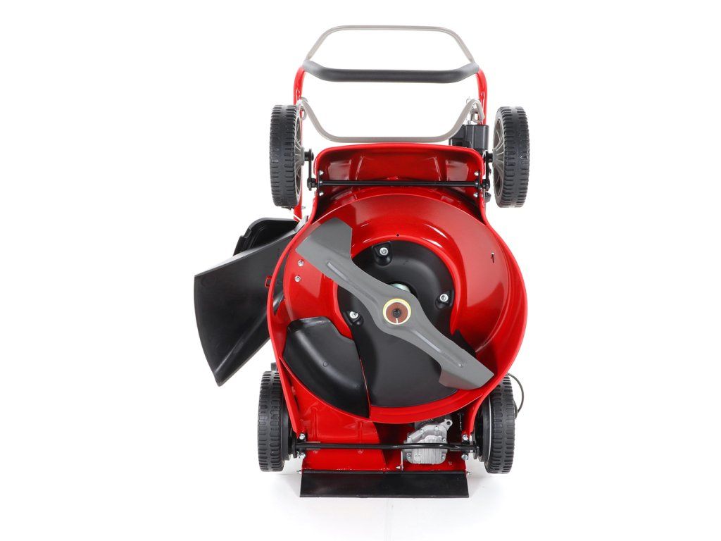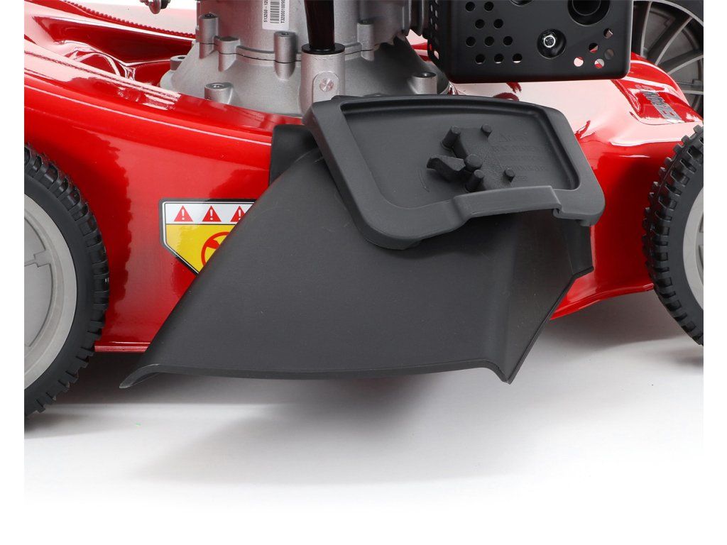 zadním deflektorem a má variabilní pojezd daný 3 rychlostní variátorovou převodovkou. Výhoda silného motoru o výkonu 6 HP a nože s velkými lopatami Vám perfektně sebere i přerostlou mokrou trávu. Pogumovaná sendvičová kola jsou uložena v oboustranných kuličkových ložiscích,