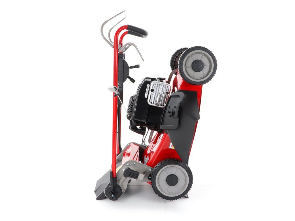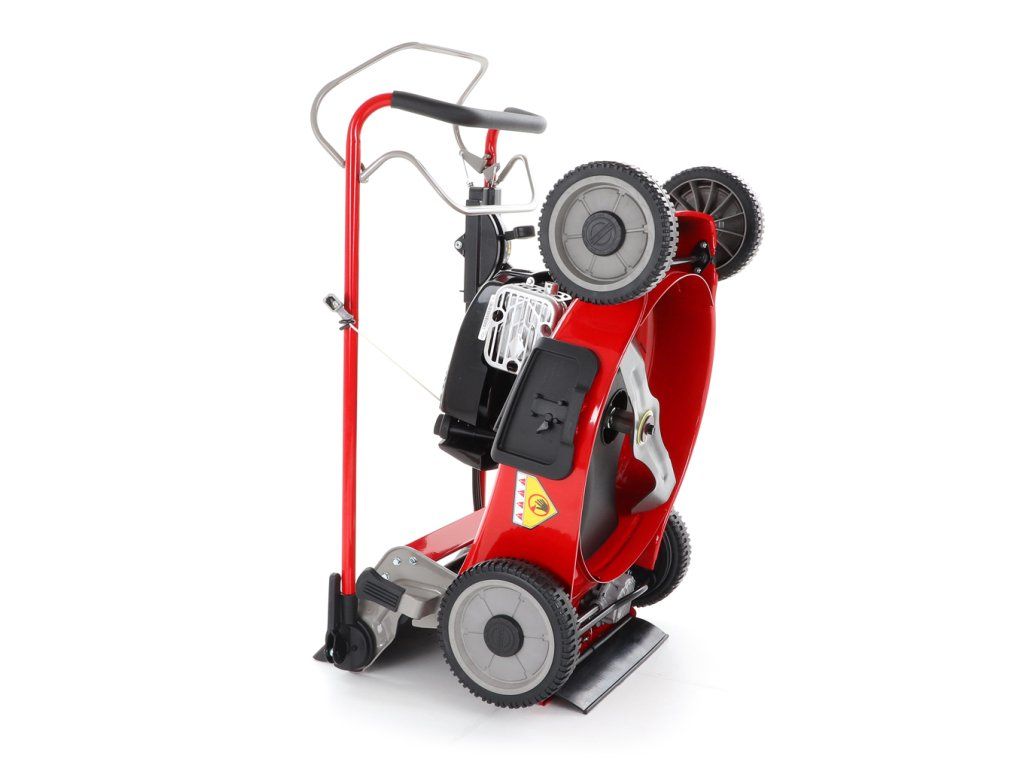 Novinkou sekačky je funkce tzv. "CHYTRÉ ŘEŠENÍ", sekačku lze pro ekonomické uskladnění, snadné čištění, servisování otočit a postavit na zadní speciální patky šasí, tímto se snadno dostanete na spodní část žacího ústrojí, uložení náprav a převodovku.