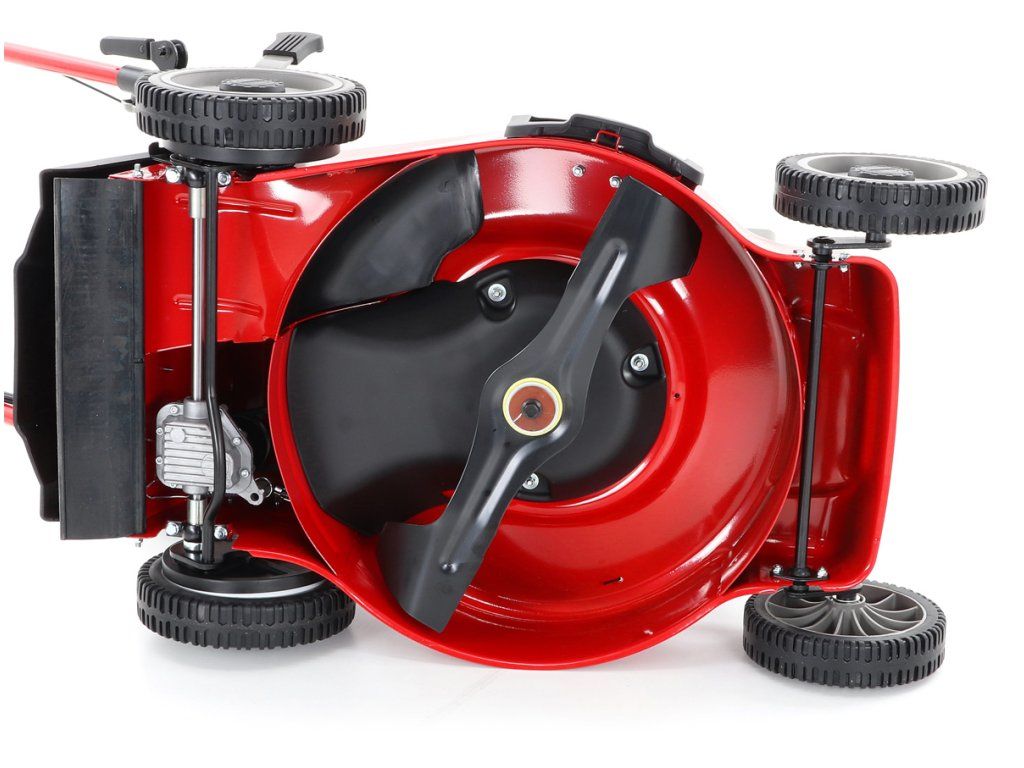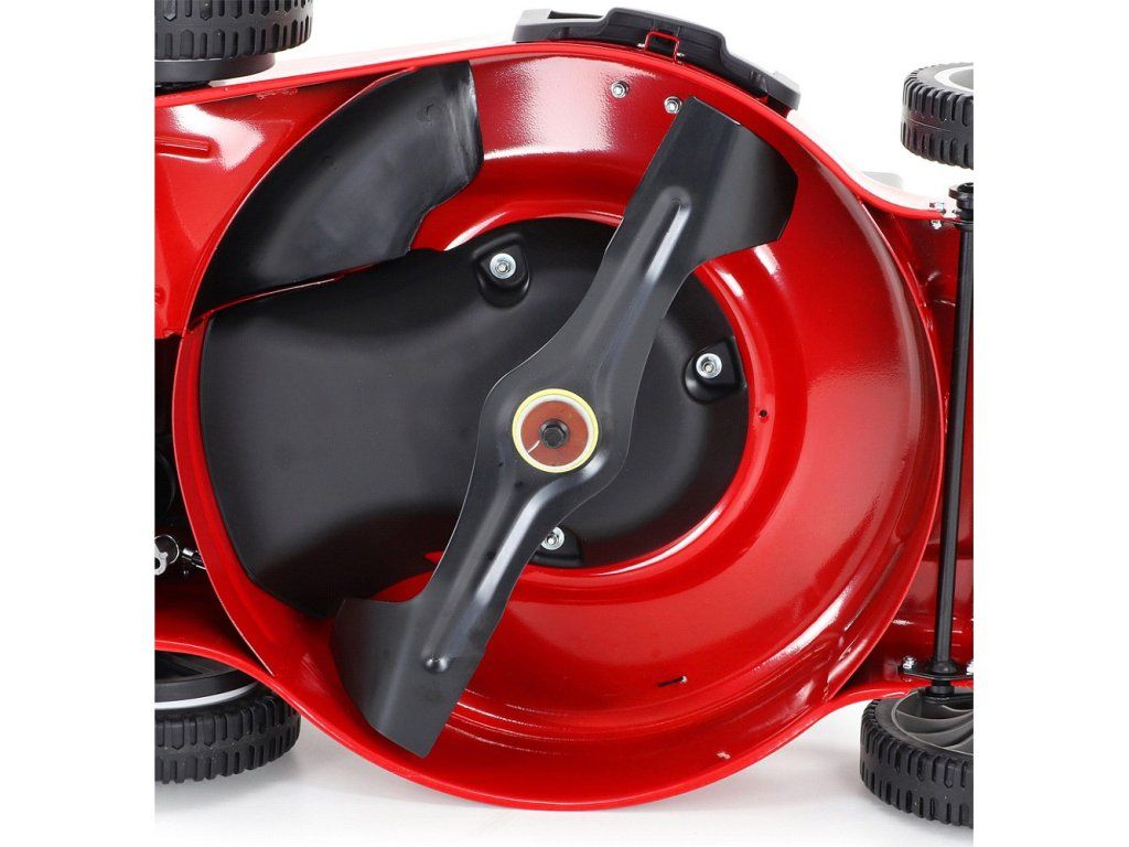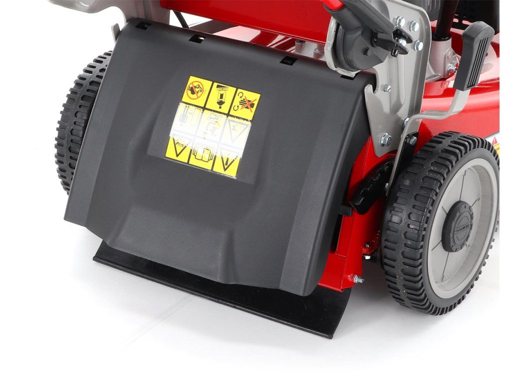 zadním deflektorem a má variabilní pojezd daný 7 rychlostní variátorovou převodovkou. Výhoda silného motoru o výkonu 6 HP a nože s velkými lopatami Vám perfektně sebere i přerostlou mokrou trávu. Pogumovaná sendvičová kola jsou uložena v oboustranných kuličkových ložiscích,