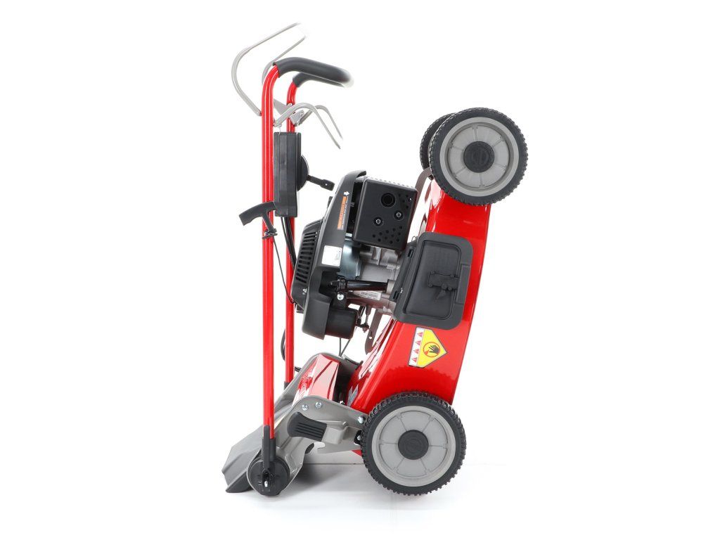 Novinkou sekačky je funkce tzv. "CHYTRÉ ŘEŠENÍ", sekačku lze pro ekonomické uskladnění, snadné čištění, servisování otočit a postavit na zadní speciální patky šasí, tímto se snadno dostanete na spodní část žacího ústrojí, uložení náprav a převodovku.