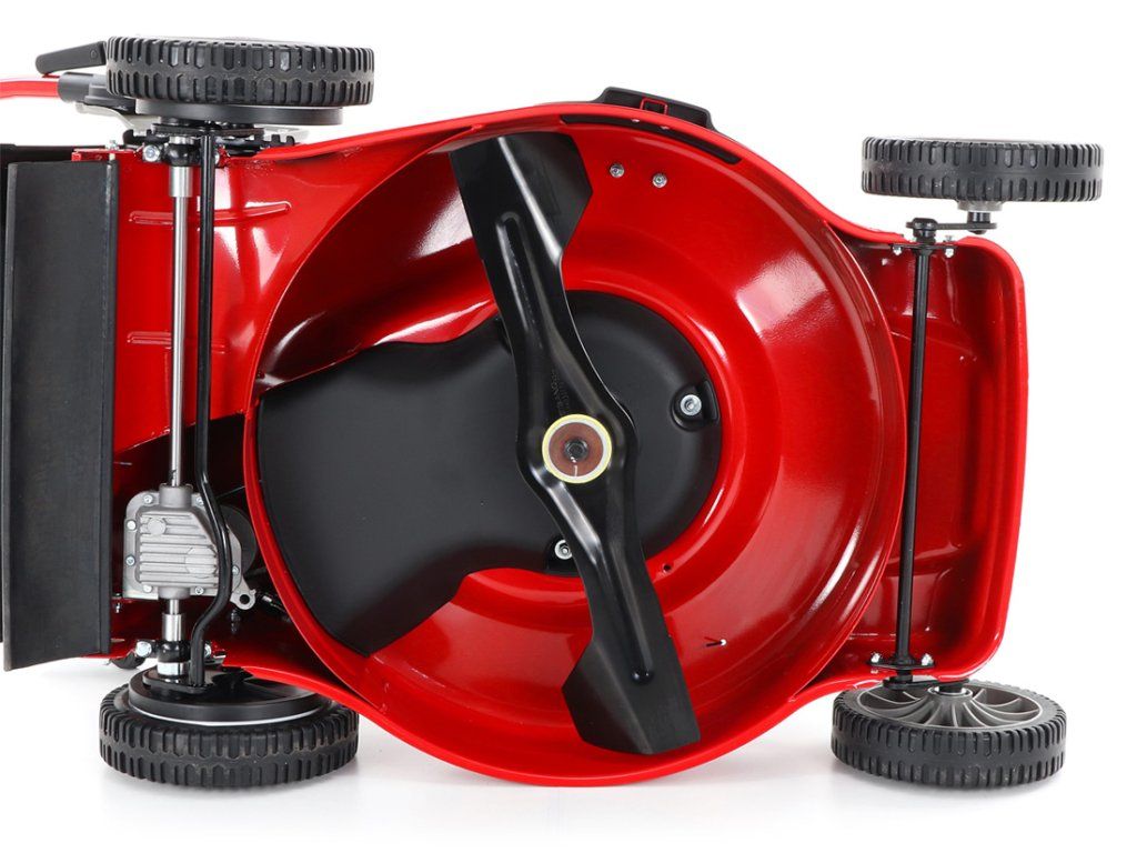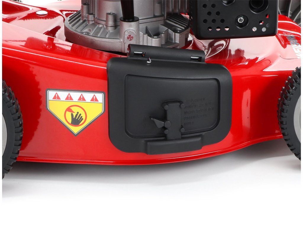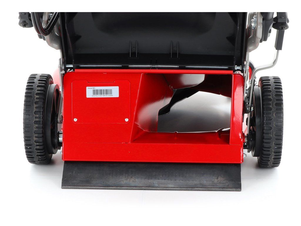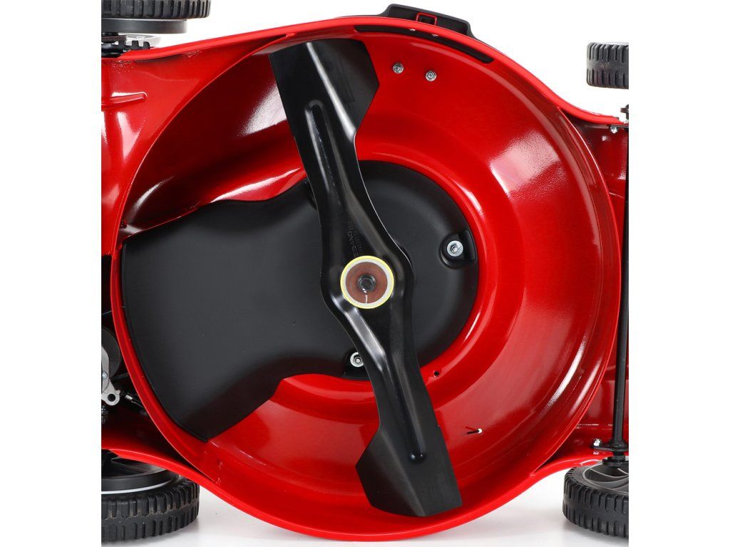 zadním deflektorem a má variabilní pojezd daný 3 rychlostní variátorovou převodovkou. Výhoda silného motoru o výkonu 6 HP a nože s velkými lopatami Vám perfektně sebere i přerostlou mokrou trávu. Pogumovaná sendvičová kola jsou uložena v oboustranných kuličkových ložiscích,