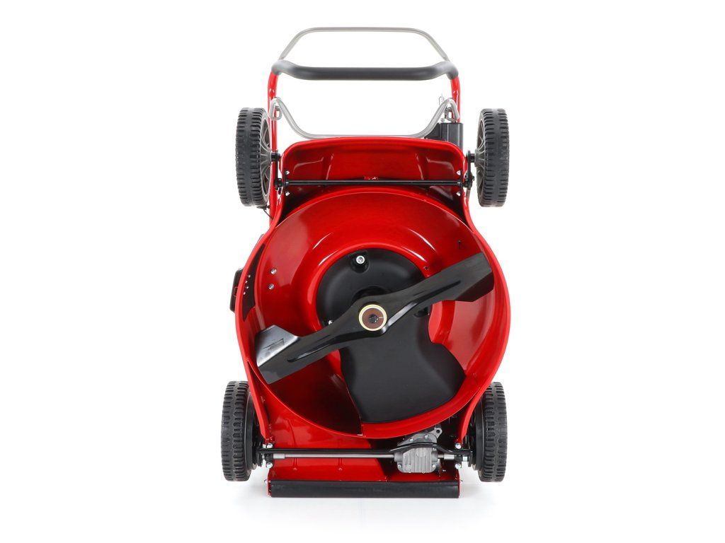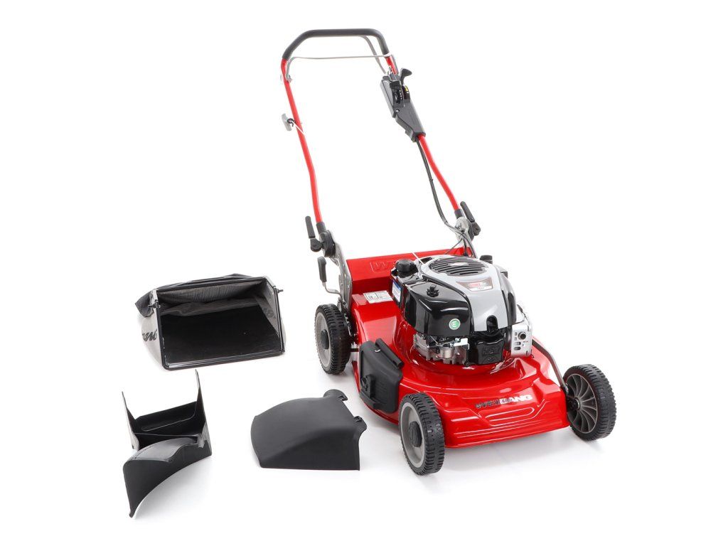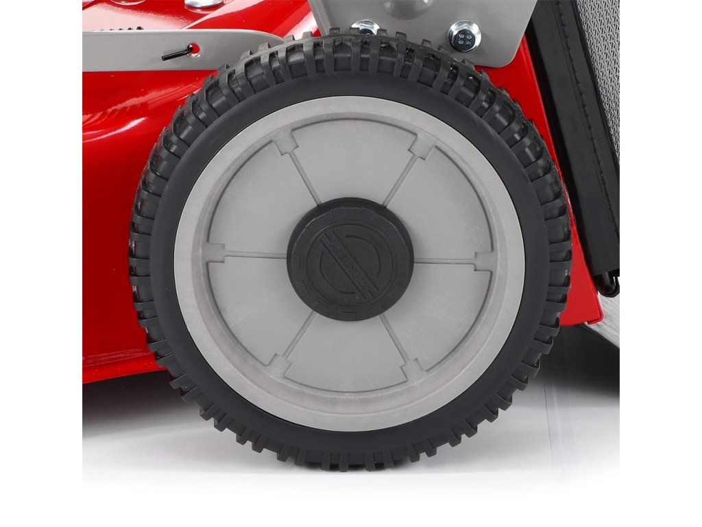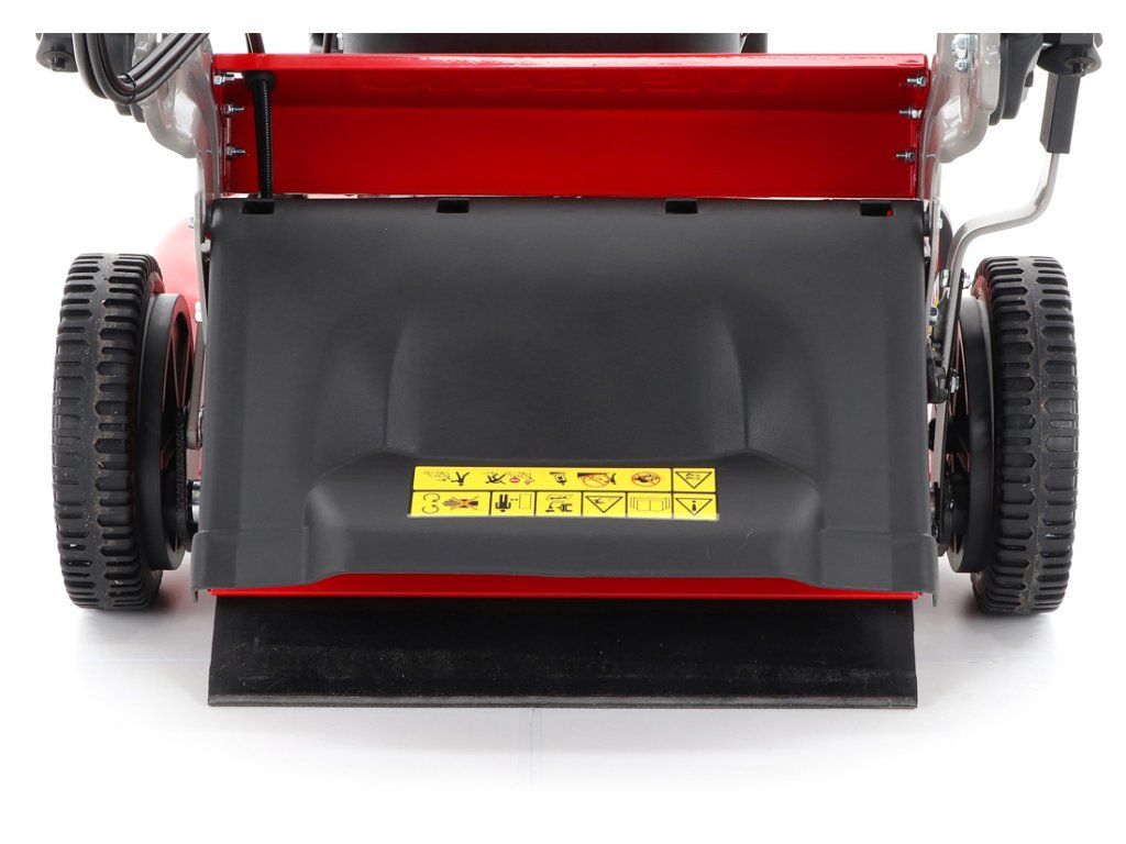 zadním deflektorem a má variabilní pojezd daný 3 rychlostní variátorovou převodovkou. Výhoda silného motoru o výkonu 6 HP a nože s velkými lopatami Vám perfektně sebere i přerostlou mokrou trávu. Pogumovaná sendvičová kola jsou uložena v oboustranných kuličkových ložiscích,