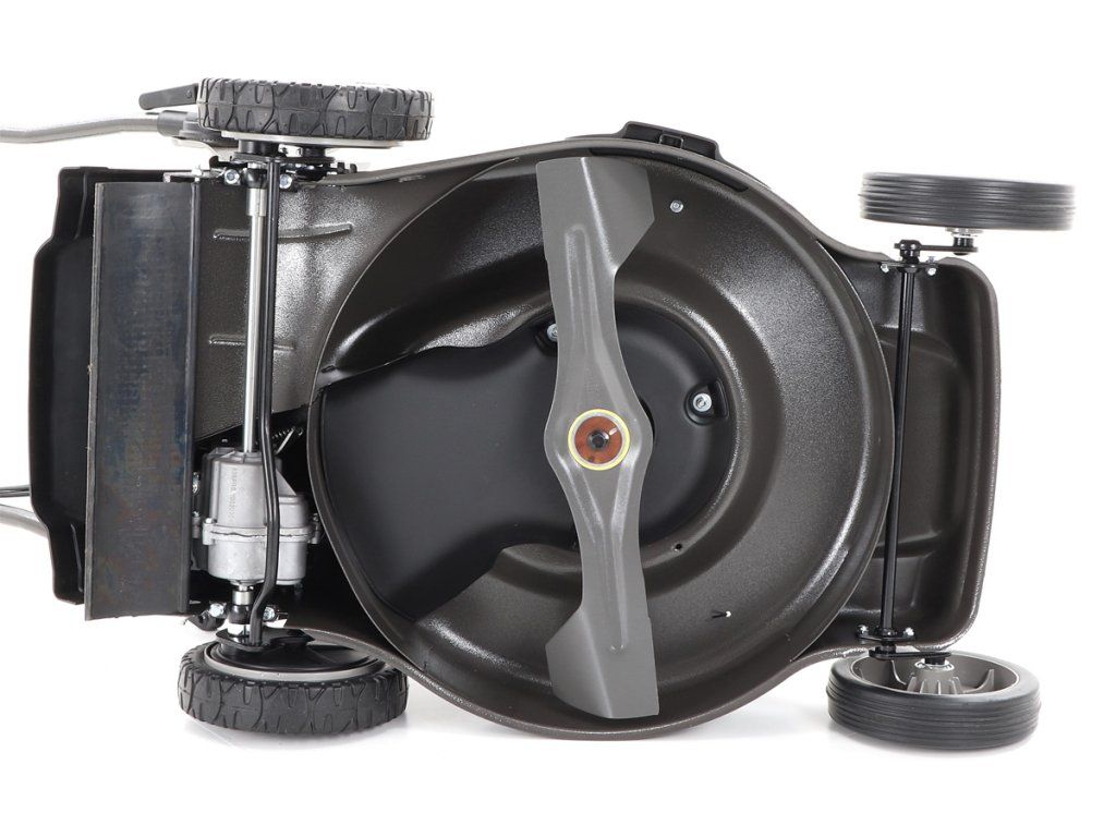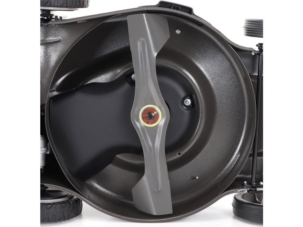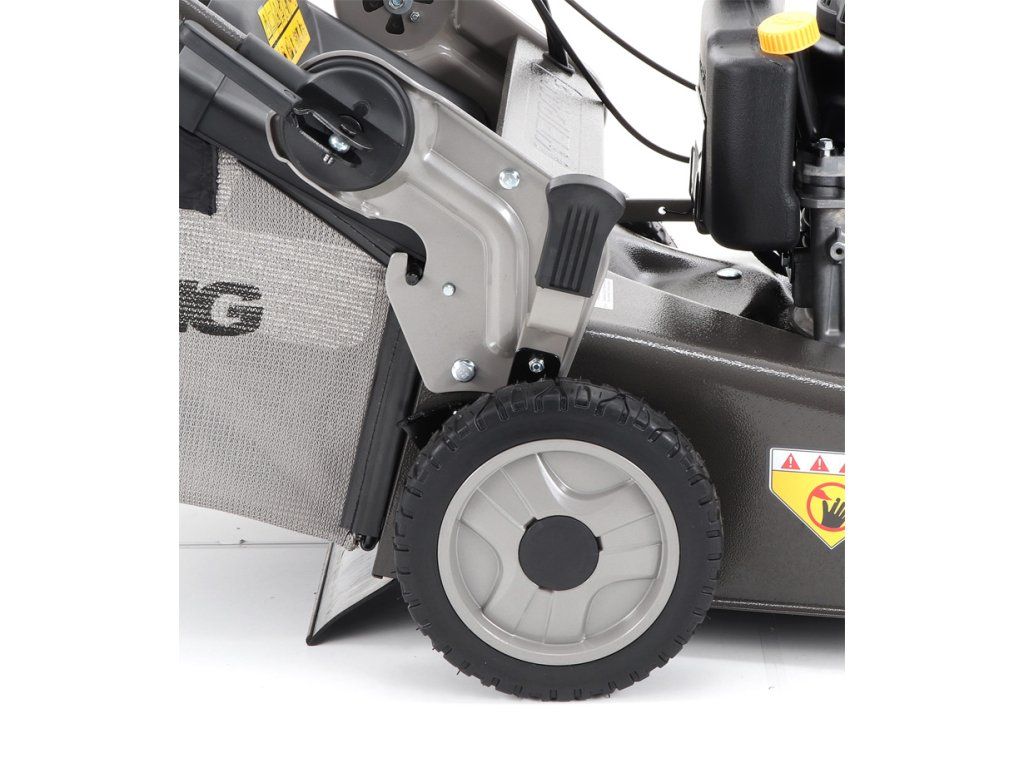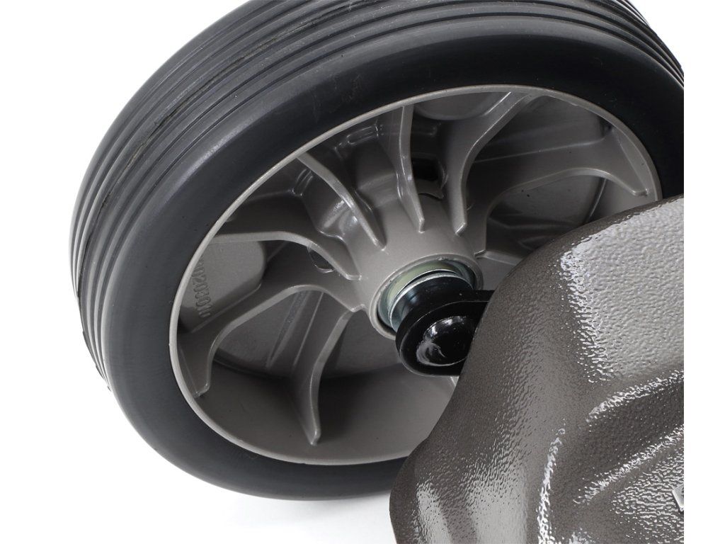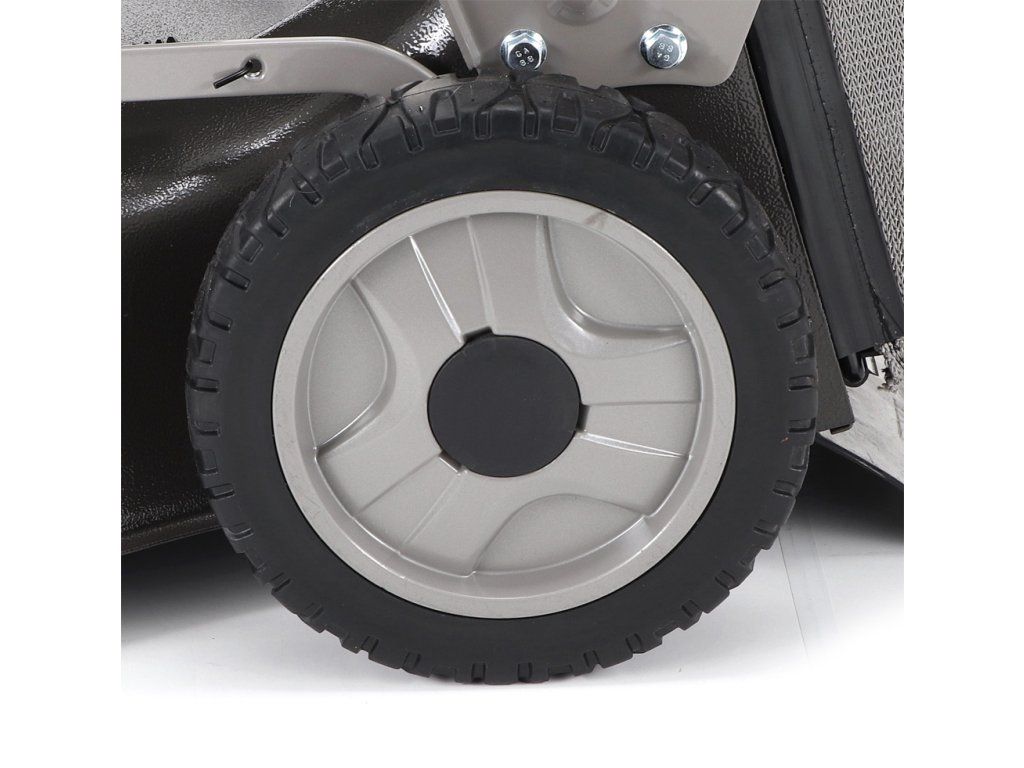 Pogumovaná sendvičová hliníková kola jsou uložena v oboustranných kuličkových ložiscích, centrální nastavení výšky sečení je u této značky samozřejmostí. Velkým nadstandardem u této sekačky je použita speciální třecí spojka na noži sekačky pod unášečem,