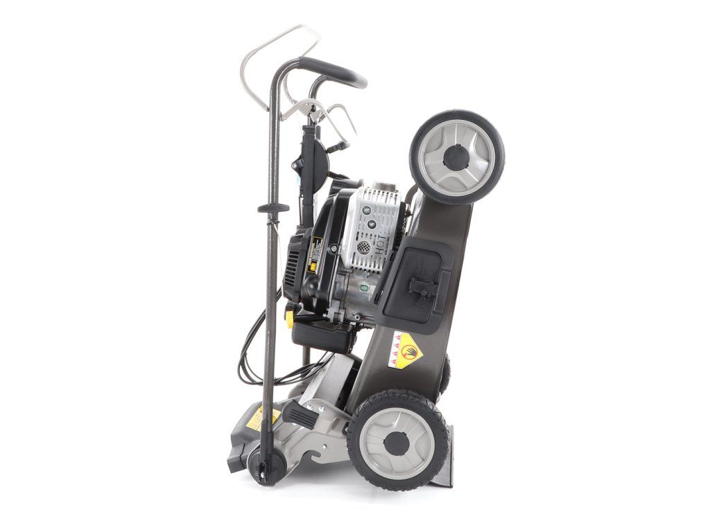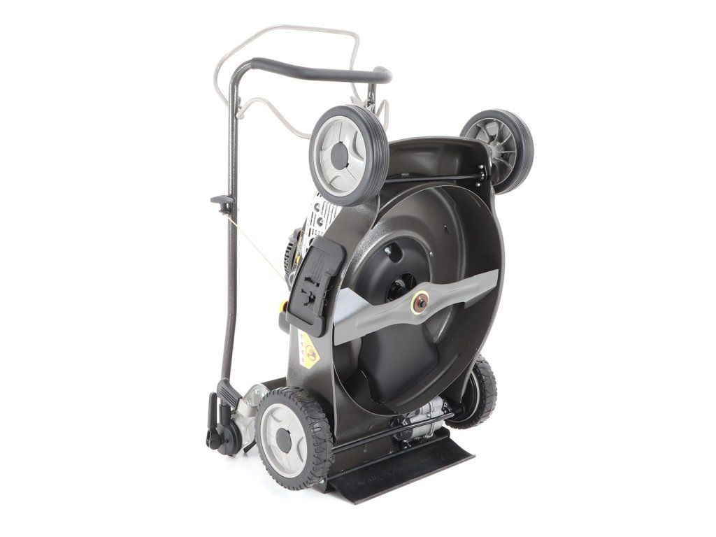 Novinkou sekačky je funkce tzv. "CHYTRÉ ŘEŠENÍ", sekačku lze pro ekonomické uskladnění, snadné čištění, servisování otočit a postavit na zadní speciální patky šasí, tímto se snadno dostanete na spodní část žacího ústrojí, uložení náprav a převodovku.