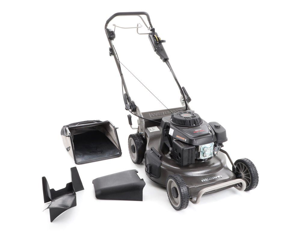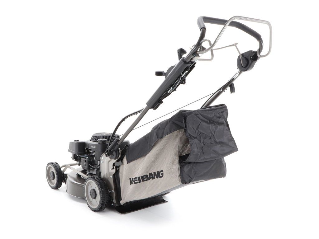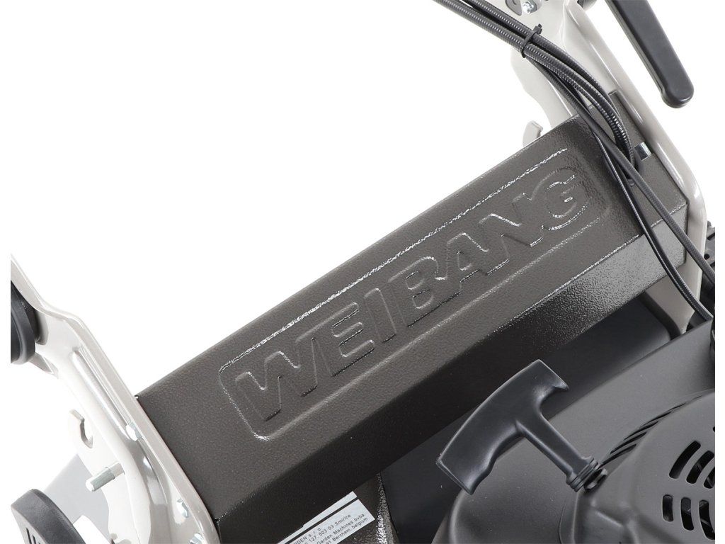 bočním výhozem, mulčovat i zadním deflektorem a má variabilní pojezd daný profesionální 3-rychlostní kovovou převodovkou. Výhoda silného motoru WEIBANG o super výkonu 7 HP a nože s velkými lopatami Vám perfektně sebere i přerostlou mokrou trávu.