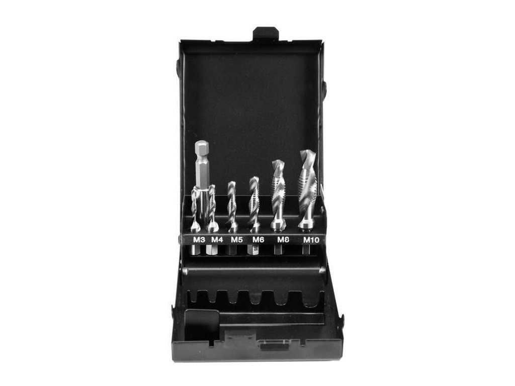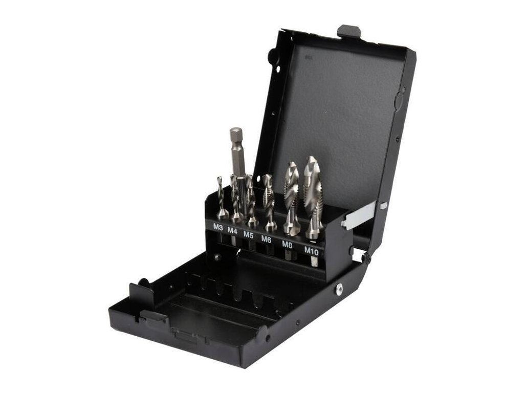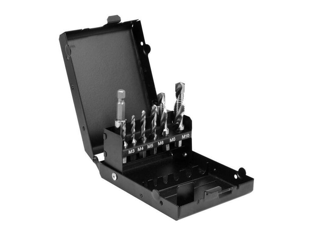 Sada 7 ks vrtáků se závitníkem jsou určeny pro vrtání přesných metrických závitů. Používá se pro strojní i ruční řezání závitů.